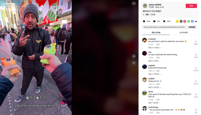 “刀乐哥”的推销方式非常“简单粗暴”,他站在纽约时代广场的人群中,手握“爆眼龙”玩具,一遍遍地重复着“吐刀乐”(Two dollar)这一简单的英文短语。无论顾客提出什么问题或需要什么颜色的玩具,他的回答永远只有一个:“吐刀乐”。