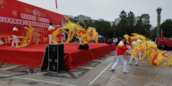 文峰塔下银龄舞,剑水河边鼓乐扬。