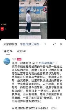 信中白浩写道:很荣幸能在蛙哥投资的华星传媒一起走过这五年的时光,感谢(蛙哥)公司各位领导在这五年里多我的包容照顾以及帮助,感恩能在公司里与大家相识,幸遇贵人相助,益友相扶,这里有我燃烧过的岁月,也有我美好的回忆,人生相逢,自是有时,约期已满今日暂别,祝愿华星传媒越来越好,蒸蒸日上,一路长虹。再次承蒙厚爱,山水有相逢,愿再次相见你我皆回巅峰,一辈子的好哥哥 青蛙哥。(永记我们并肩作战的时光)