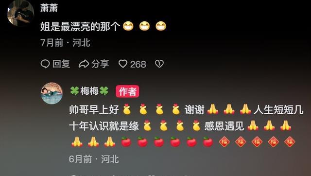 一个23岁的男大萧萧出现了,这是他第一次亮相,只是给梅梅评论了几个大拇指。