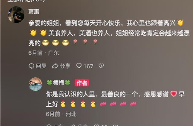 回到广东之后,萧萧还是按部就班,每天坚持在梅梅的评论区,各种花样夸赞,不管是舞姿还是手艺,只要是梅梅分享的,萧萧都会称赞。