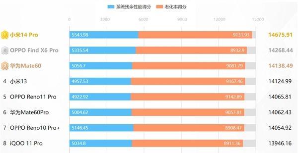 近日,鲁大师发布了“久用流畅排行榜”前十名,入选机型基本是老面孔,并且无一例外都是旗舰机。榜单显示,小米这边一共有两款机型入选,小米13排名第四,搭载了澎湃OS的小米14Pro以14675.91分的总成绩,仅8.68%的老化率排名第一,华为Mate60屈居第三,低调的OPPOFindX6Pro排名第二。