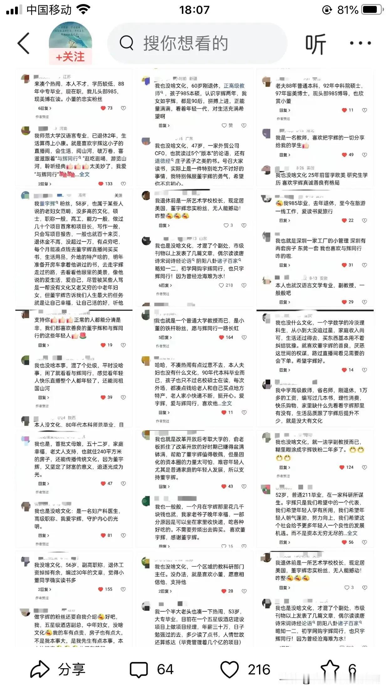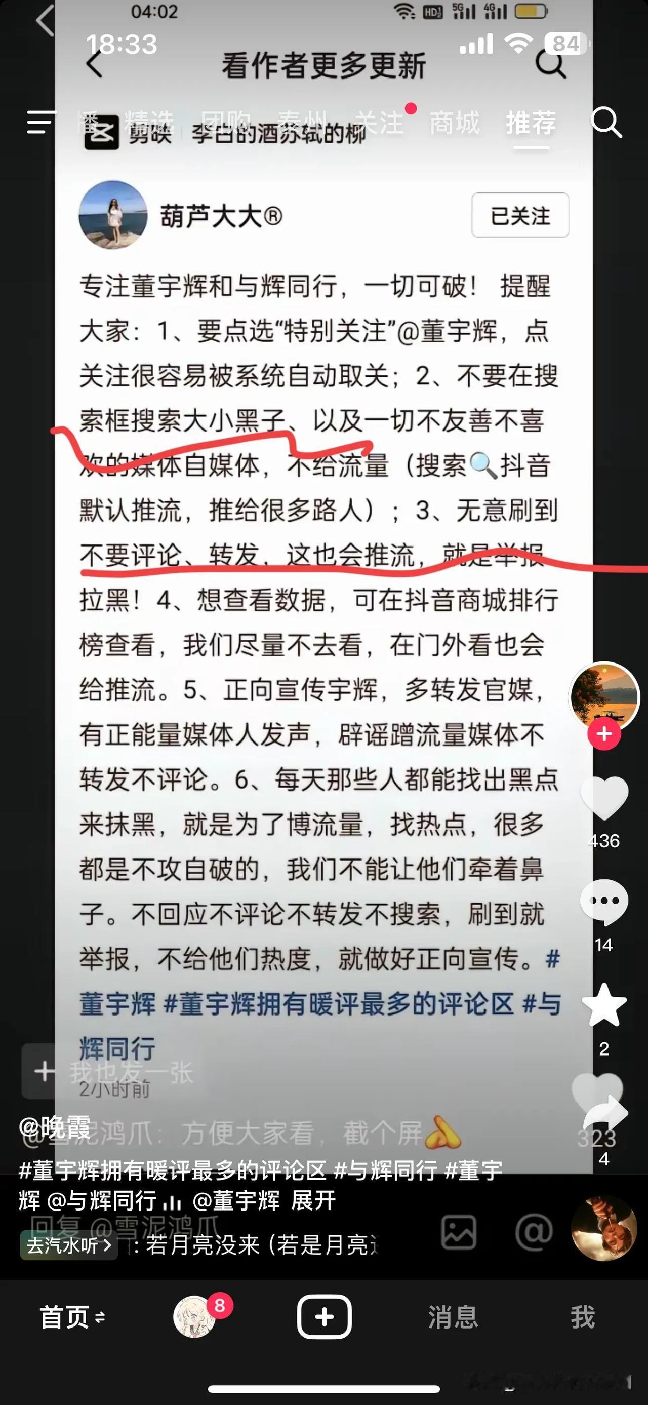 俞敏洪评论区打开后,大家发现没有,zmn们少了,去拉踩的人也少了!这归功于粉头的功劳! 目前顶流的粉丝有所谓高人指点,比如一些带货老丈人,比如一些带货卖查数据会员的一些组织!给zmn们传道授业!xmn们的执行力相当不错! 比如第一个,值得赞!俞老师评论区打开了,大家不要去评论!做知性优雅zmn!我也赞成👍 比如第二条应该是听了某些查数据的课,说什么不要搜索,不要点击等等!我想说:抖音如果被你们这样拿捏,那还是抖音吗! 不过看来第三张,第四张图、你们也就理解了!虽然董宇辉现在一再强调他们的消费者都市白领较多!但是无论时评论区留言,还是到处做任务的zmn,还有跟现场的情况,跟用户画像不符合啊!