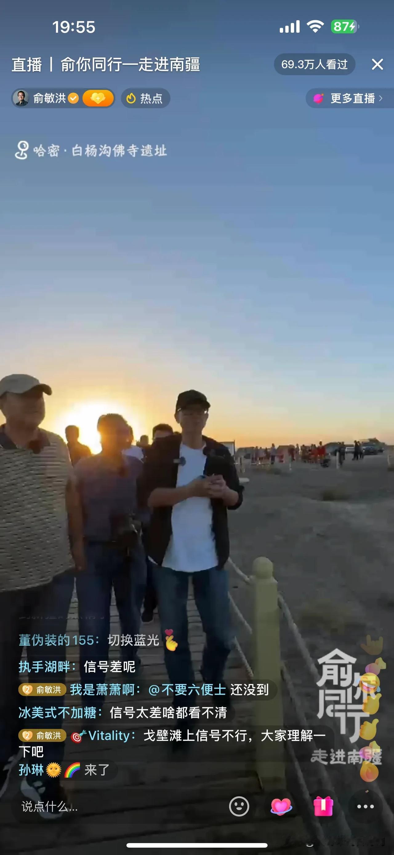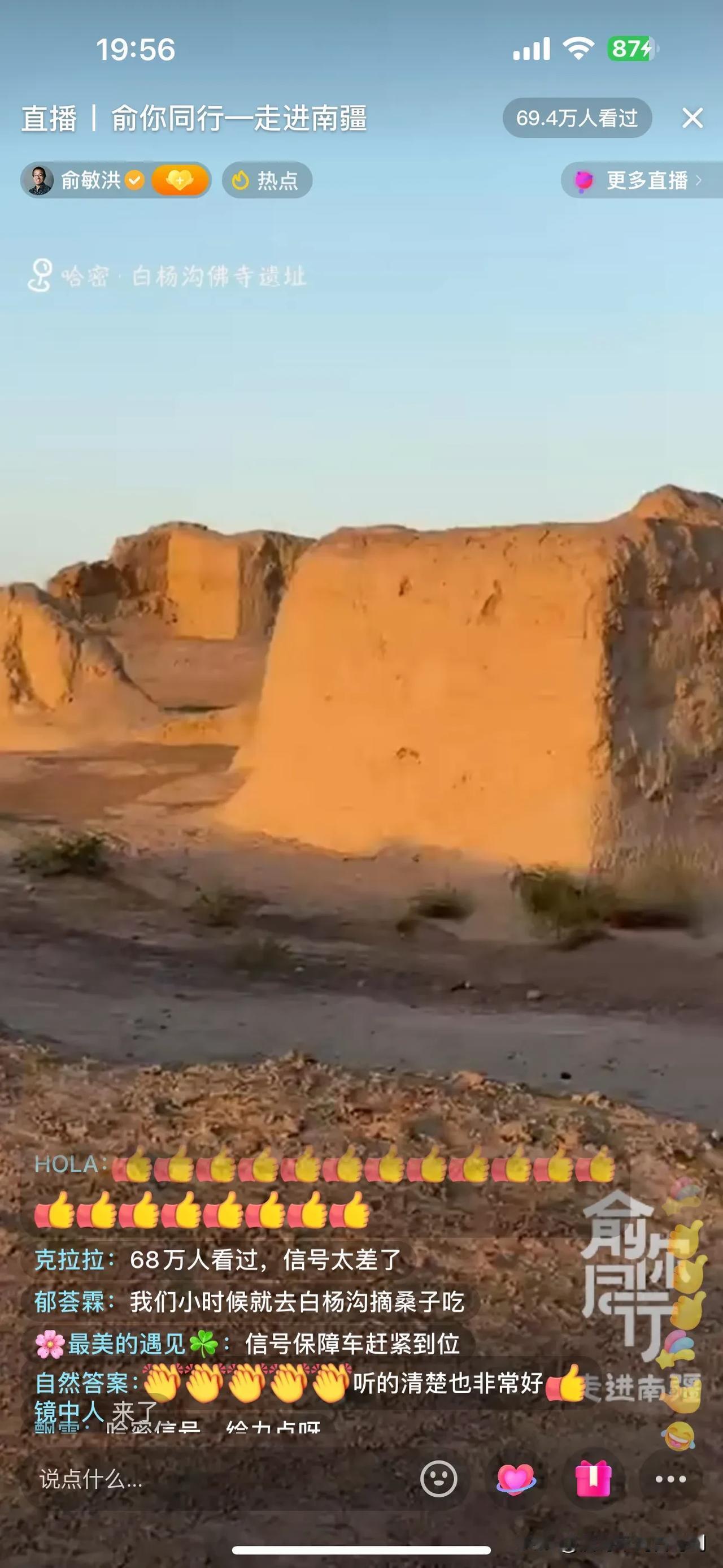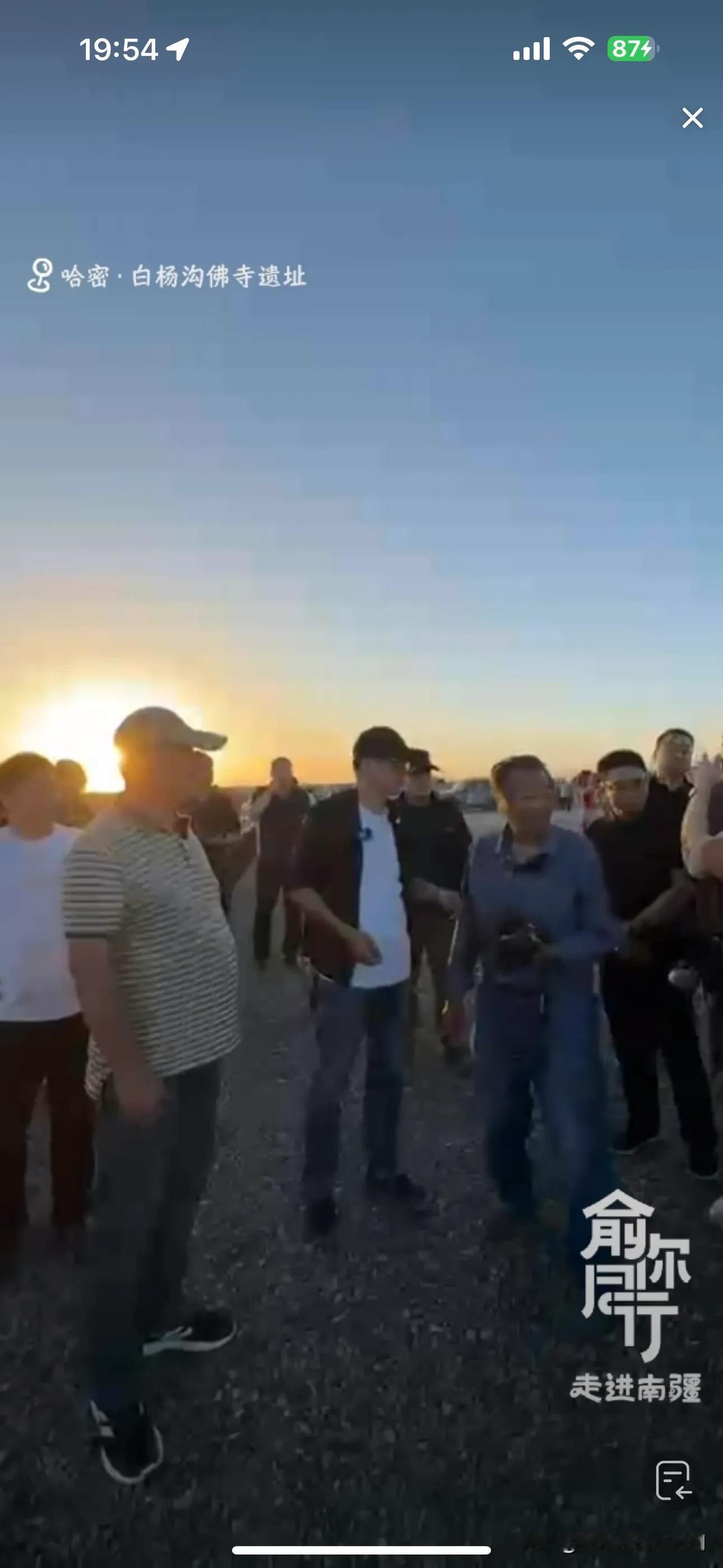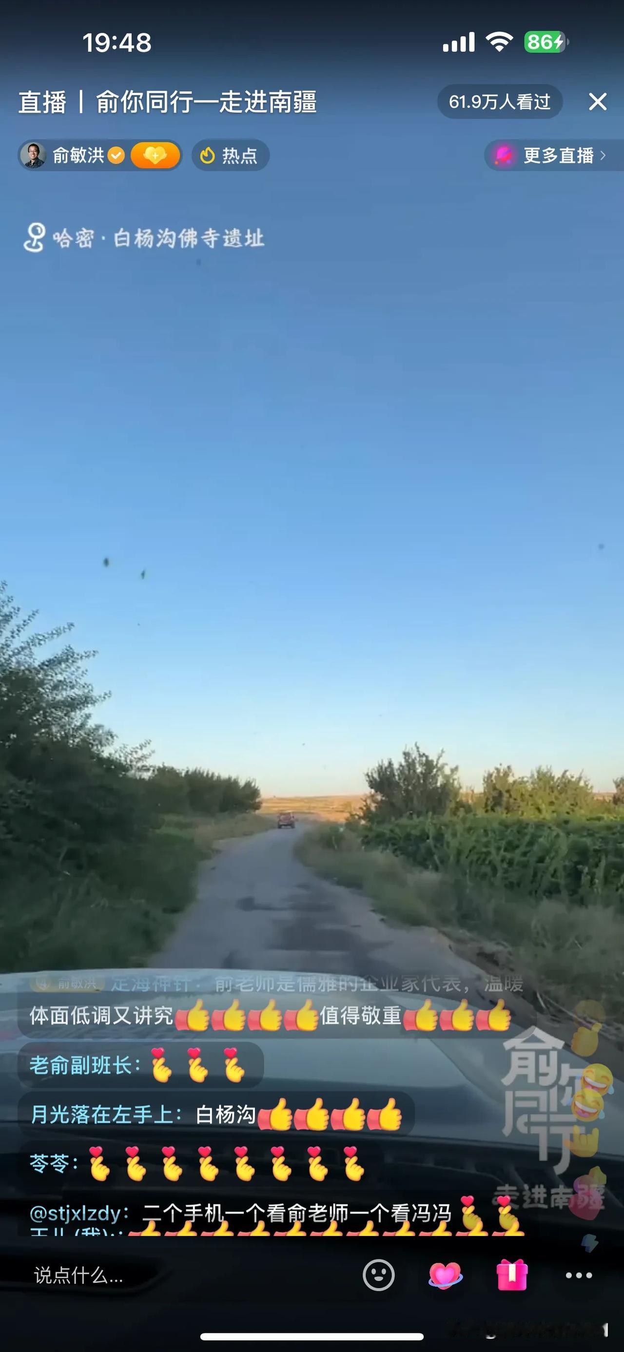 俞敏洪新疆行,今天下午由于信号问题,没有直播!晚上带大家云游白杨沟佛寺遗址! 一路上,俞老师给大家介绍下午的经历,比如吃手抓饭,游览的景点,并提到蒙曼老师也在新疆,并联系看是否能够碰面,如果行程安排不了,可以连线!另外,施展老师后期会加入行程,俞老师调侃施老师恨不得现在就加入,可惜走不开! 俞老师今天大部分时间都在车上,一路颠簸,爆胎好几条!很幸苦! 到达景点,俞老师非常坦诚,今天这个景点没有做功课,都要靠老师们介绍了! 今天根本看不过来,冯冯和薛兆丰教授的访谈已经开始!