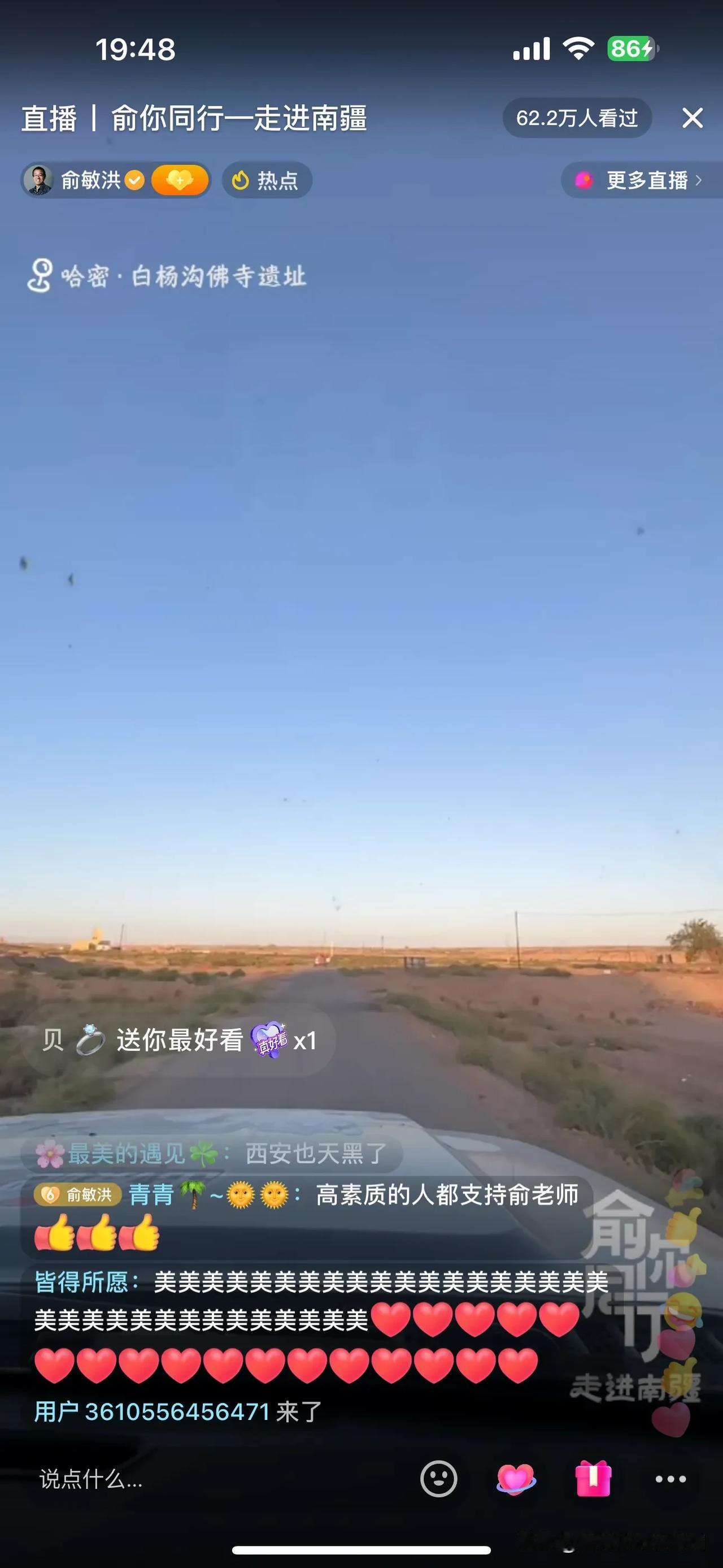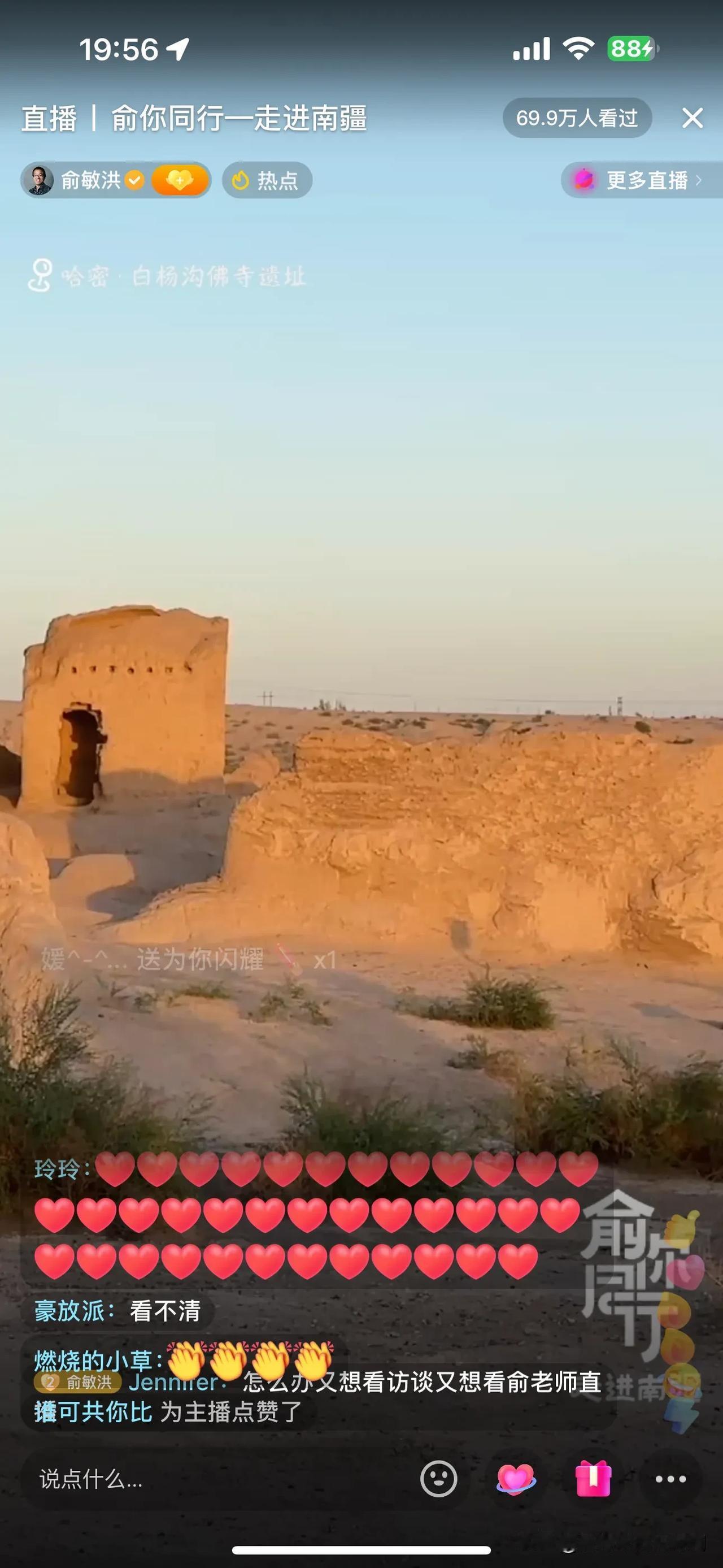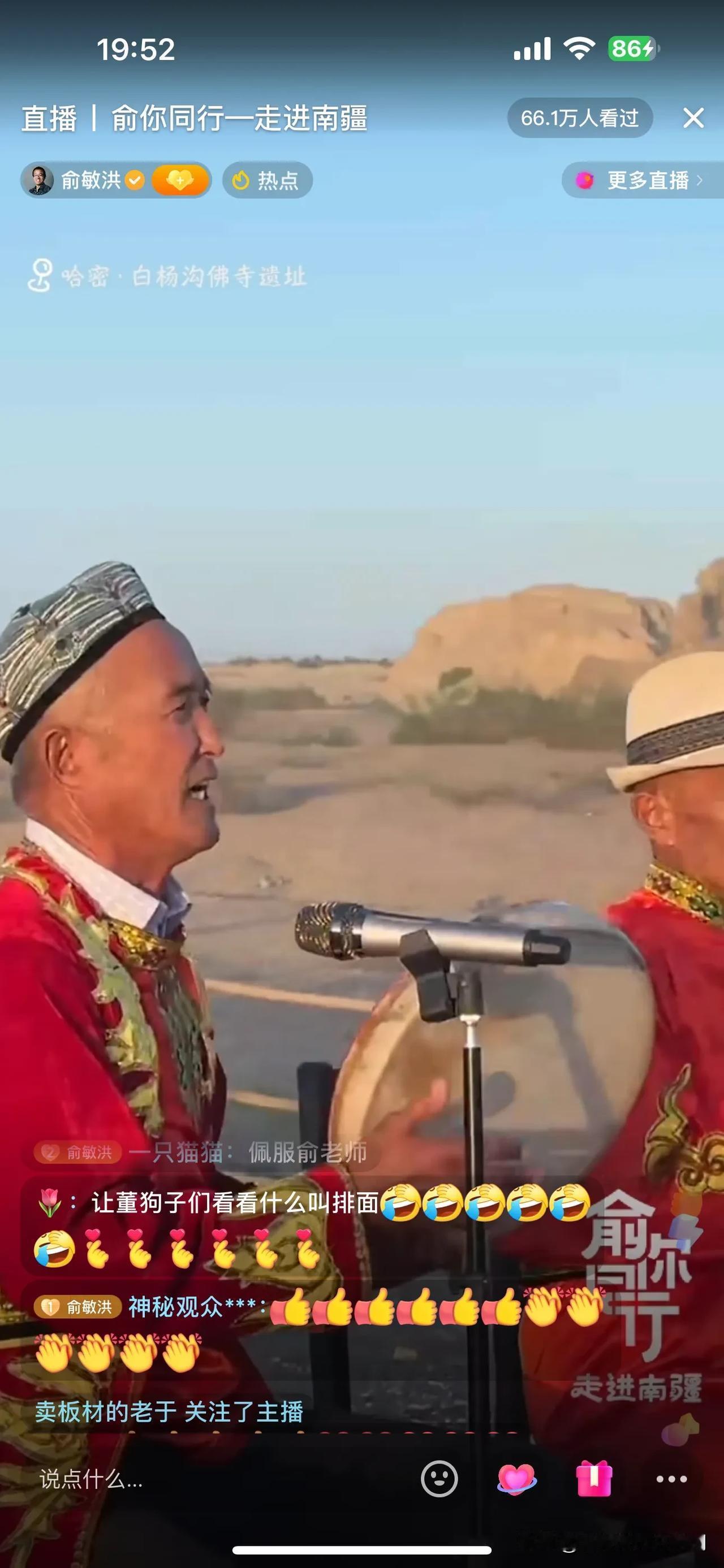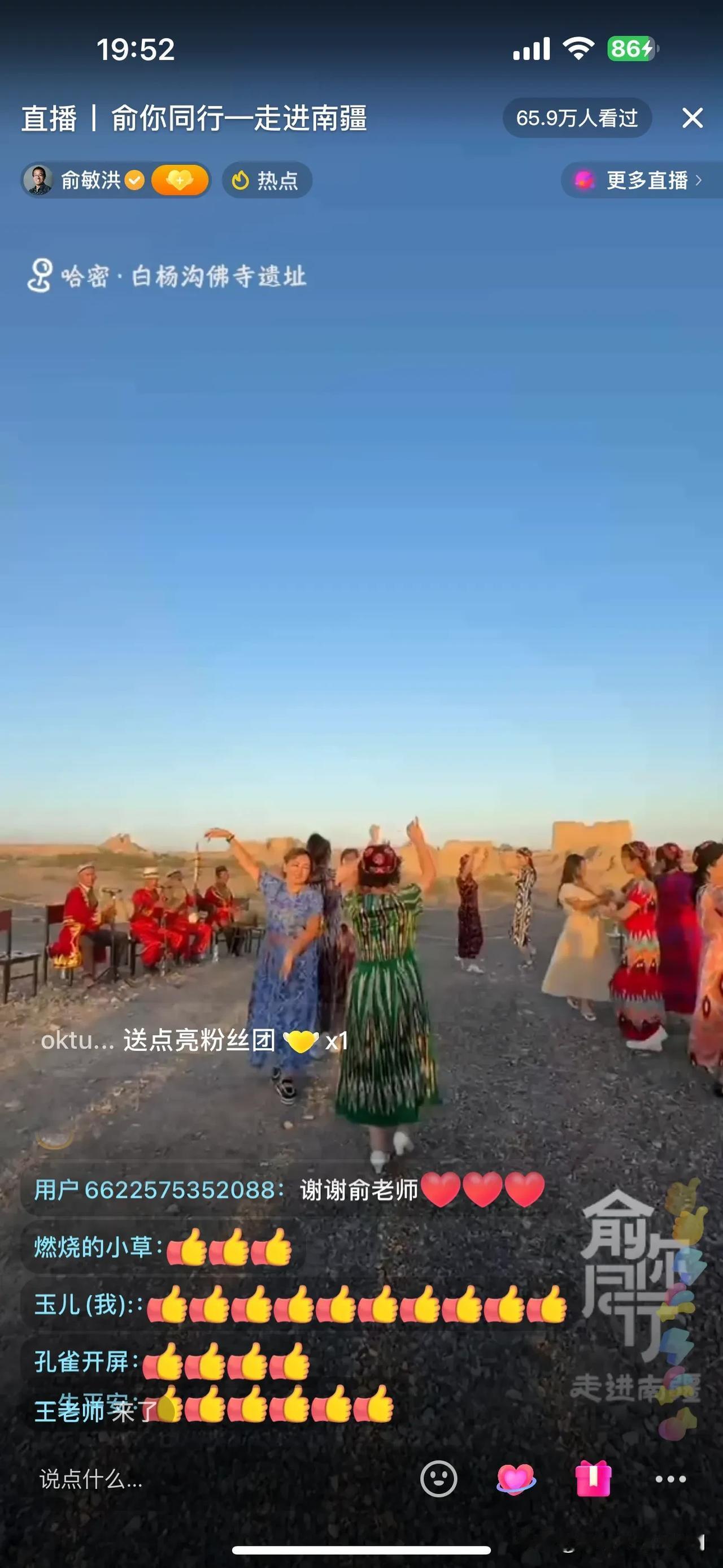 俞敏洪新疆行,今天下午由于信号问题,没有直播!晚上带大家云游白杨沟佛寺遗址! 一路上,俞老师给大家介绍下午的经历,比如吃手抓饭,游览的景点,并提到蒙曼老师也在新疆,并联系看是否能够碰面,如果行程安排不了,可以连线!另外,施展老师后期会加入行程,俞老师调侃施老师恨不得现在就加入,可惜走不开! 俞老师今天大部分时间都在车上,一路颠簸,爆胎好几条!很幸苦! 到达景点,俞老师非常坦诚,今天这个景点没有做功课,都要靠老师们介绍了! 今天根本看不过来,冯冯和薛兆丰教授的访谈已经开始!