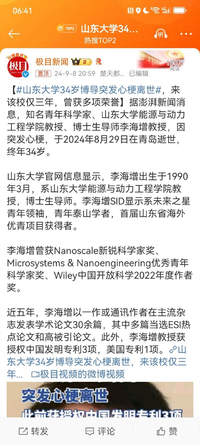 【山东大学34岁博导突发心梗离世】真是天妒英才!这是一个令人痛心的消息,一位年仅