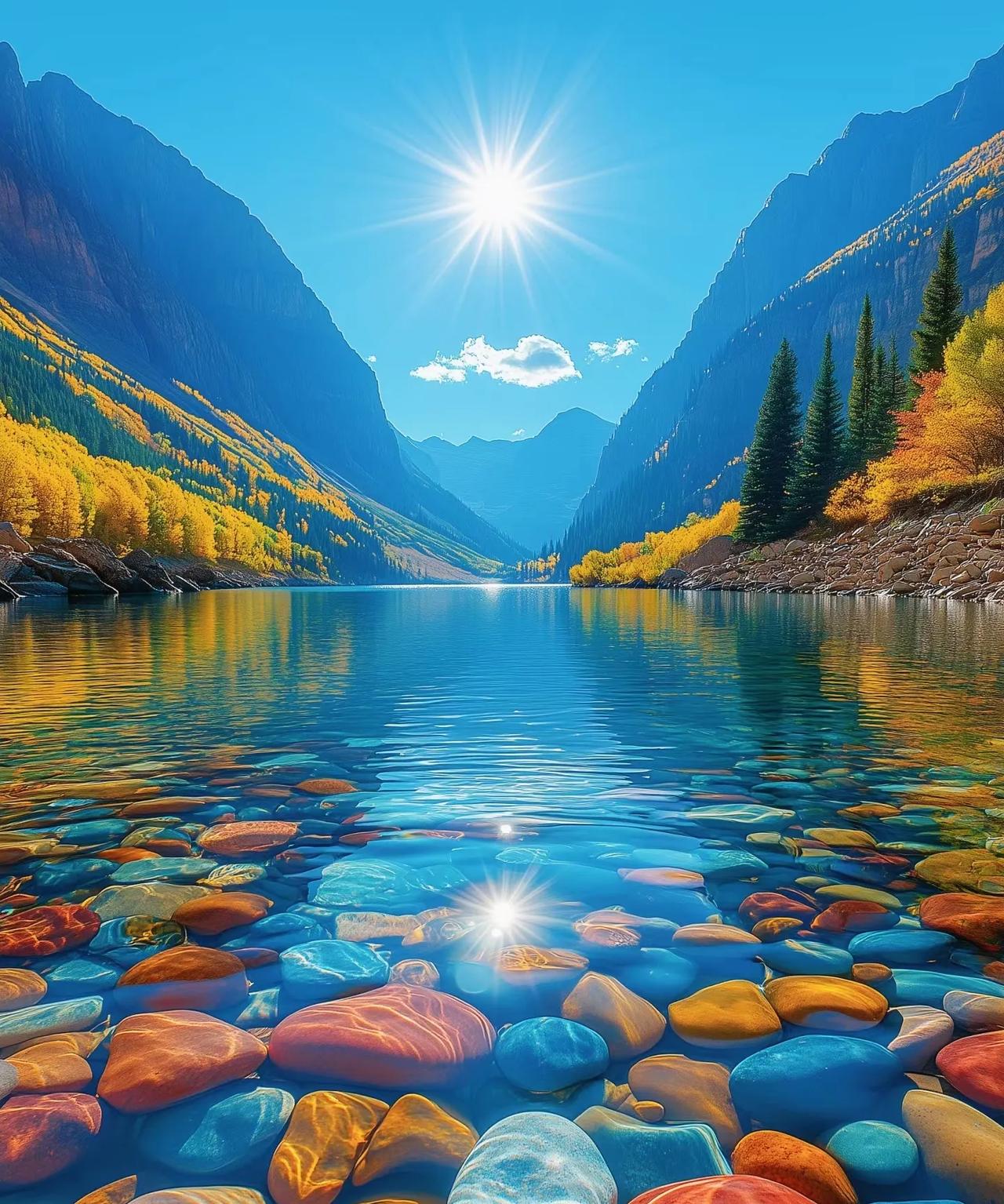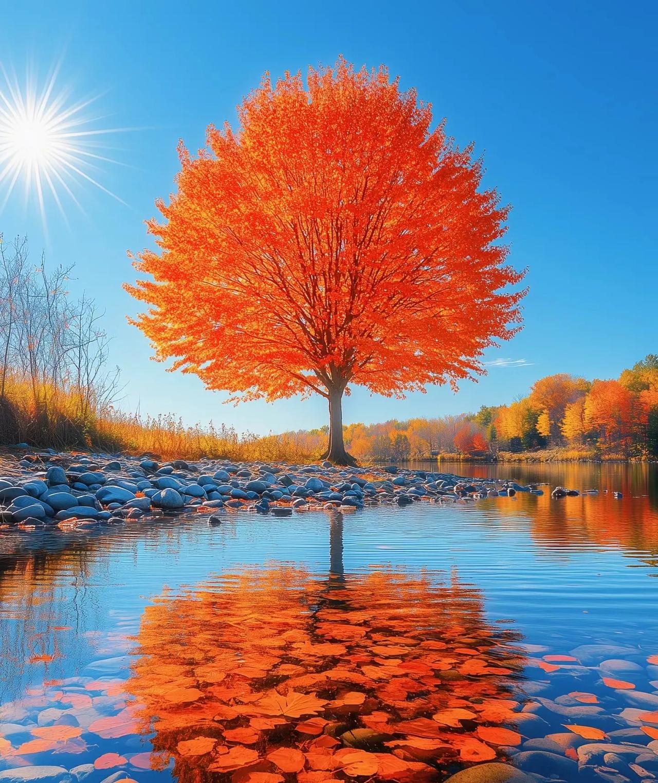 湖水清澈见底,宛如明镜一般,几颗色彩斑斓的石头静静躺在水底,仿佛是大自然遗落的瑰宝。它们在阳光的照射下,散发出绚丽的光彩,与枫叶的飘舞交相辉映,构成了一幅如梦如幻的秋日画卷。 风儿掠过湖面,带来一圈圈细小的涟漪,仿佛是时光在心湖中泛起的层层回忆。站在湖边,目睹这秋日的美景,所有的喧嚣似乎都已远去,只剩下宁静与美好。秋天,它带着一种神秘的魔力,让人们不自觉地放下心中的重负,在这片枫叶飘舞、湖水静谧的地方,找到久违的安宁。 生命就像湖中的石头,经过岁月的磨砺,逐渐显露出斑斓的色彩。时光如水,轻轻抚过,带走了繁杂与喧嚣,留下的,是秋日里的从容与温暖。愿每个人都能在这片秋色中,找到内心的宁静,让每一片枫叶、每一颗石头都成为你秋日记忆中的珍贵篇章。 此刻的湖畔,静谧而壮美。枫叶的艳丽、湖水的清澈、石头的斑斓,都交织在一起,形成了一幅美丽的画卷。这画卷中蕴含着岁月的温柔与静美,让人沉醉其中,流连忘返。