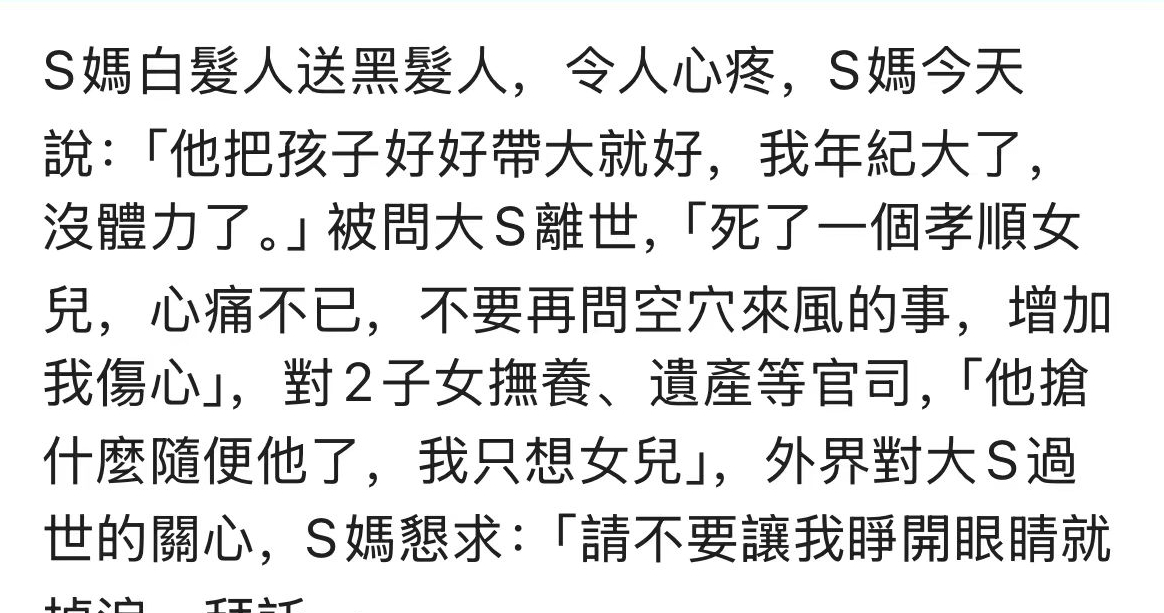 大S病逝,S妈(黄春梅)白发人送黑发人,伤心欲绝。