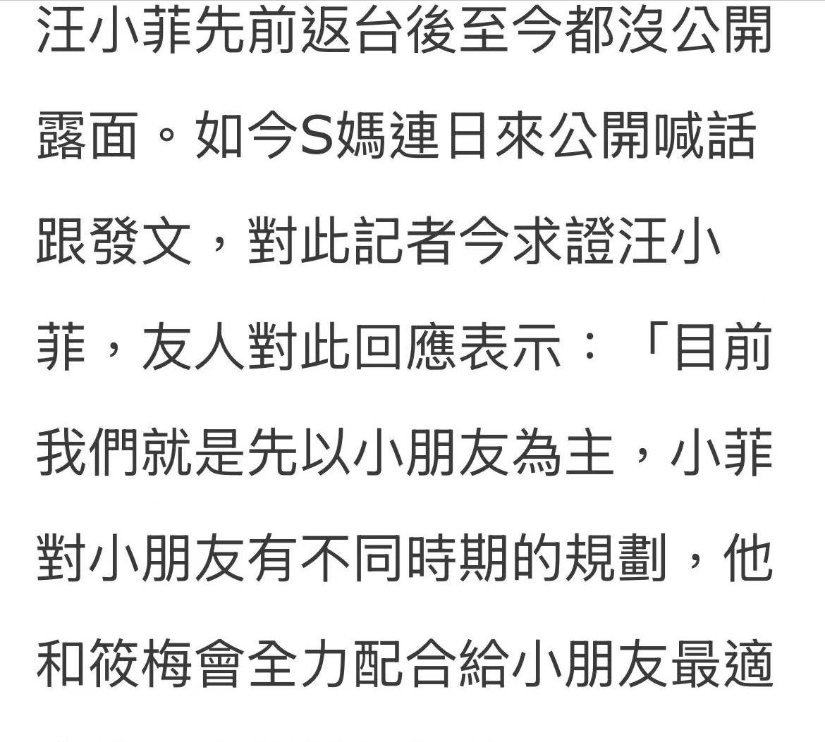 当记者就 S 妈连日来的公开喊话和发文向汪小菲求证时,汪小菲再次派出朋友回应,“目前我们就是先以小朋友为主,小菲对小朋友有不同时期的规划,他和筱梅会全力配合给小朋友最适合的,也就是最好的。”