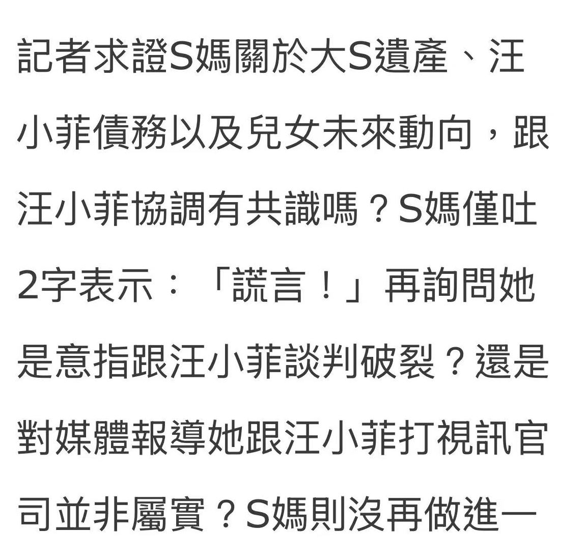 此前,台媒曾报道 S 妈与汪小菲进行了视频官司,对此,S 妈仅以 “谎言” 两字回应,这更加深了事件的神秘色彩。