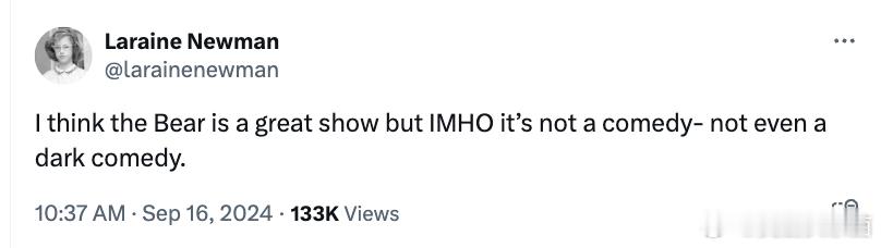 原SNL卡司Laraine Newman发推「每次我想到《熊家餐馆》拿下艾美喜剧奖项,我的胃溃疡就要犯了」和「去他妈的《熊家餐馆》」,在被剧粉质疑后,她再次发推称「我认为《熊家餐馆》是部好剧,但说实话它并不是喜剧,甚至不是黑色喜剧」