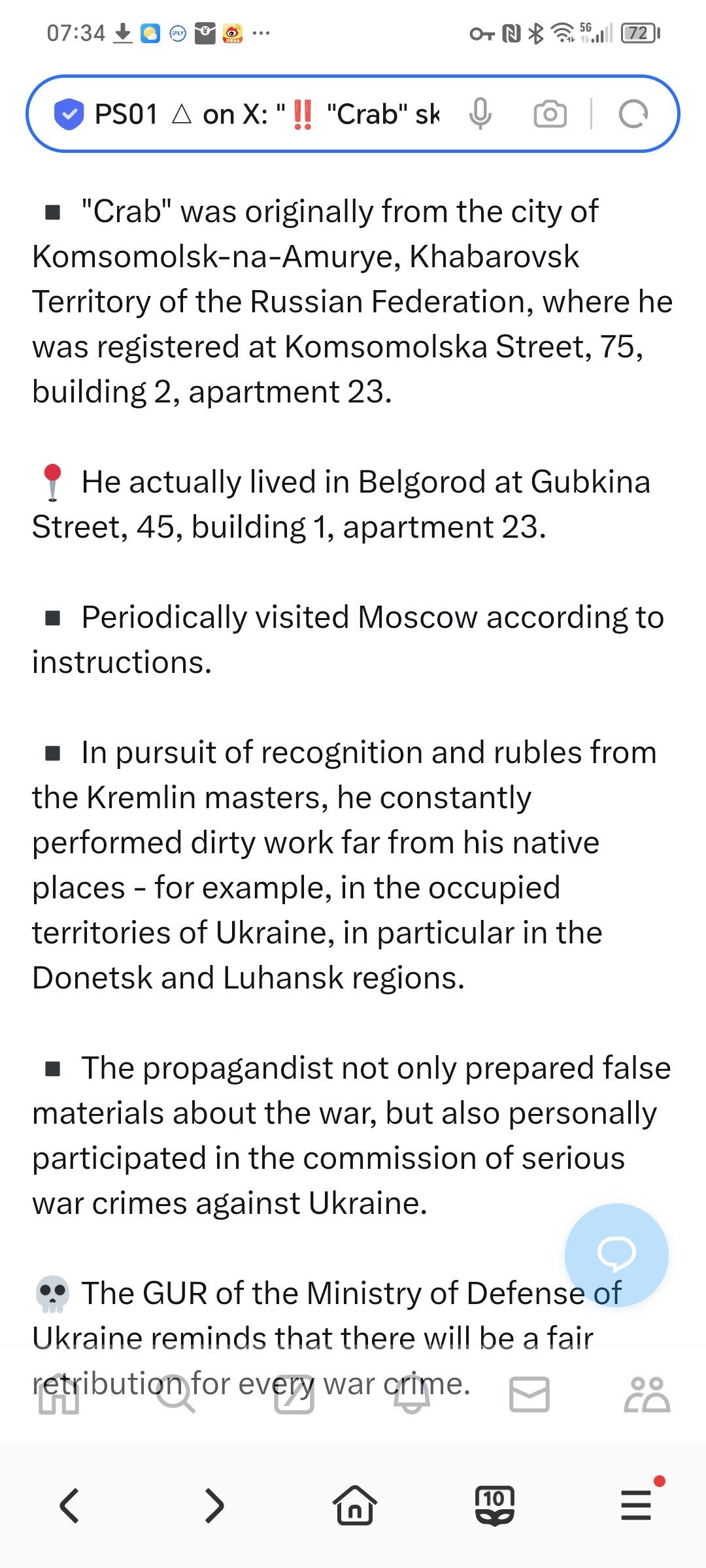 "螃蟹 "最初来自俄罗斯联邦哈巴罗夫斯克边疆区的共青城,他登记住在共青城大街 75 号 2 号楼 23 号公寓。而他实际上住在别尔哥罗德市 Gubkina 街 45 号 1 号楼 23 号公寓。
