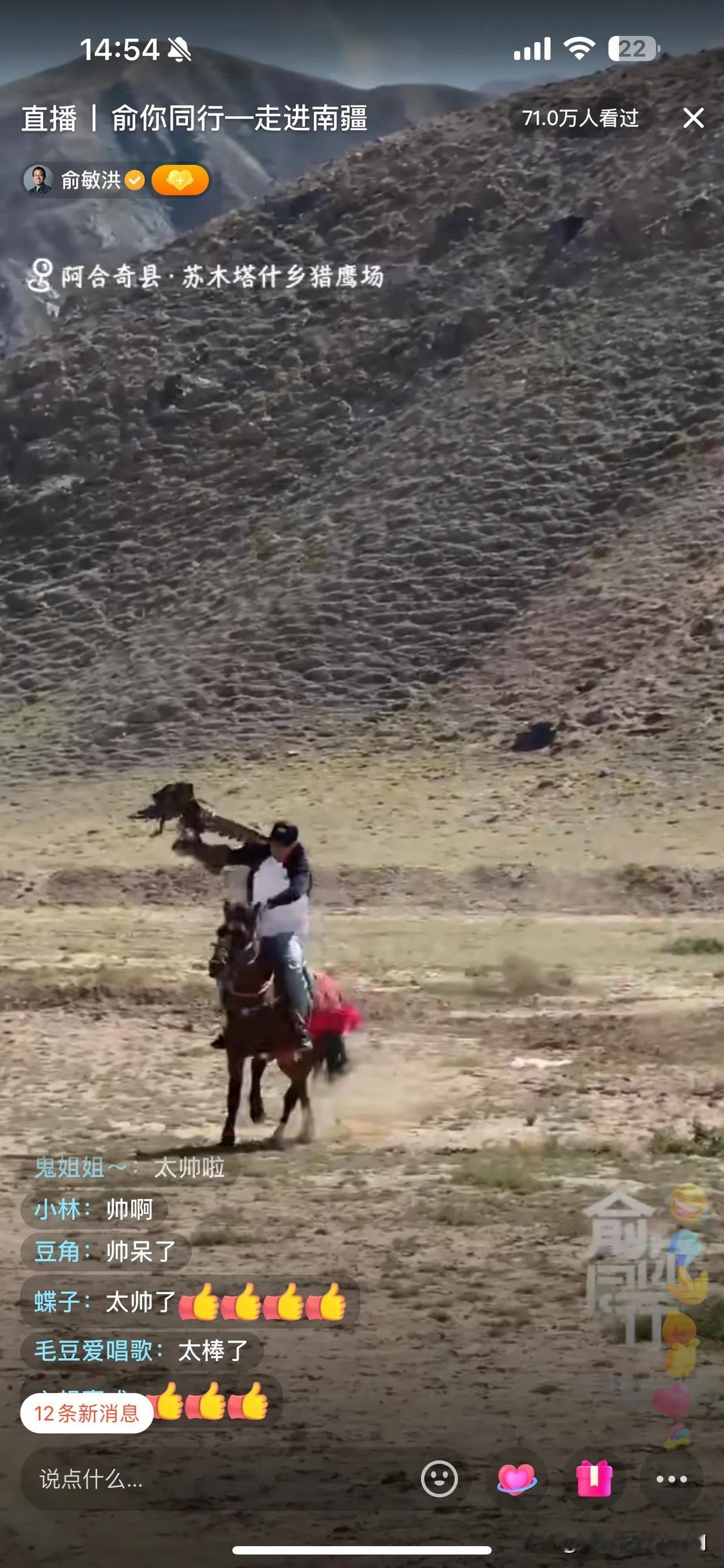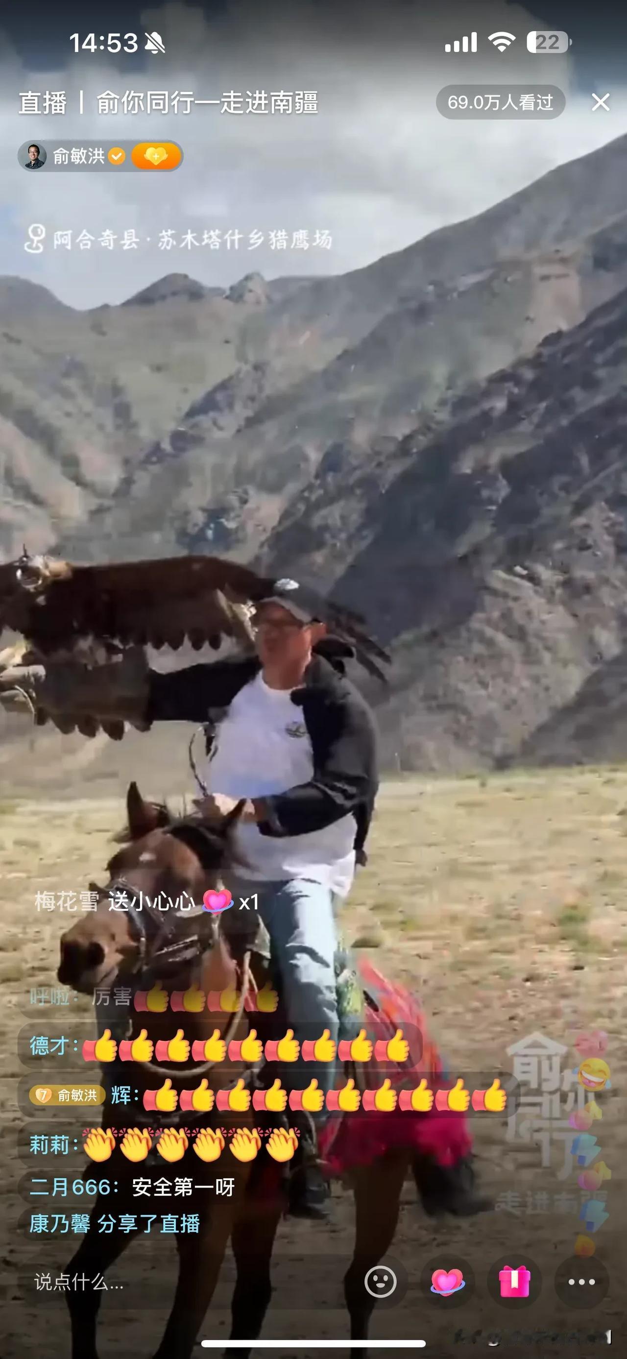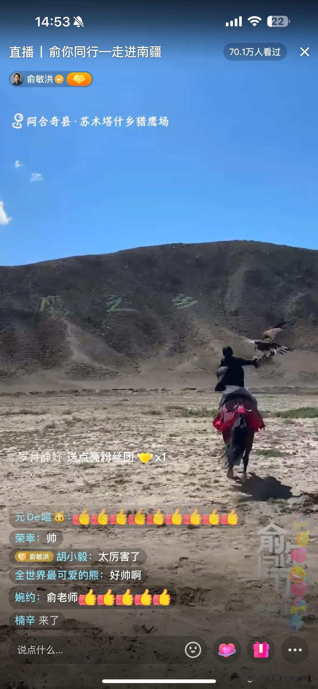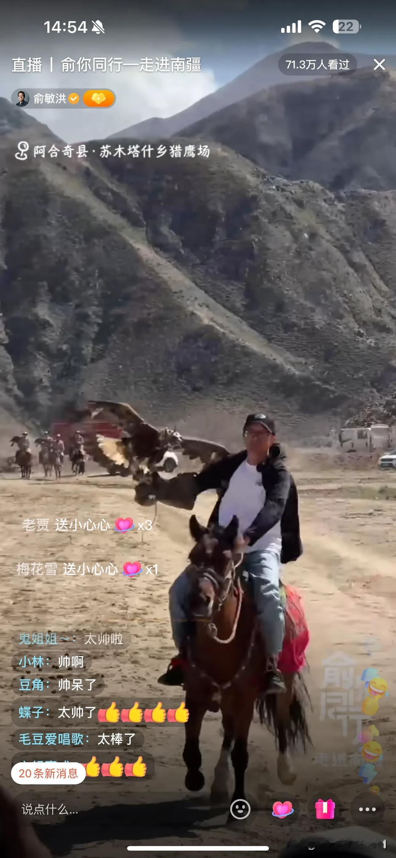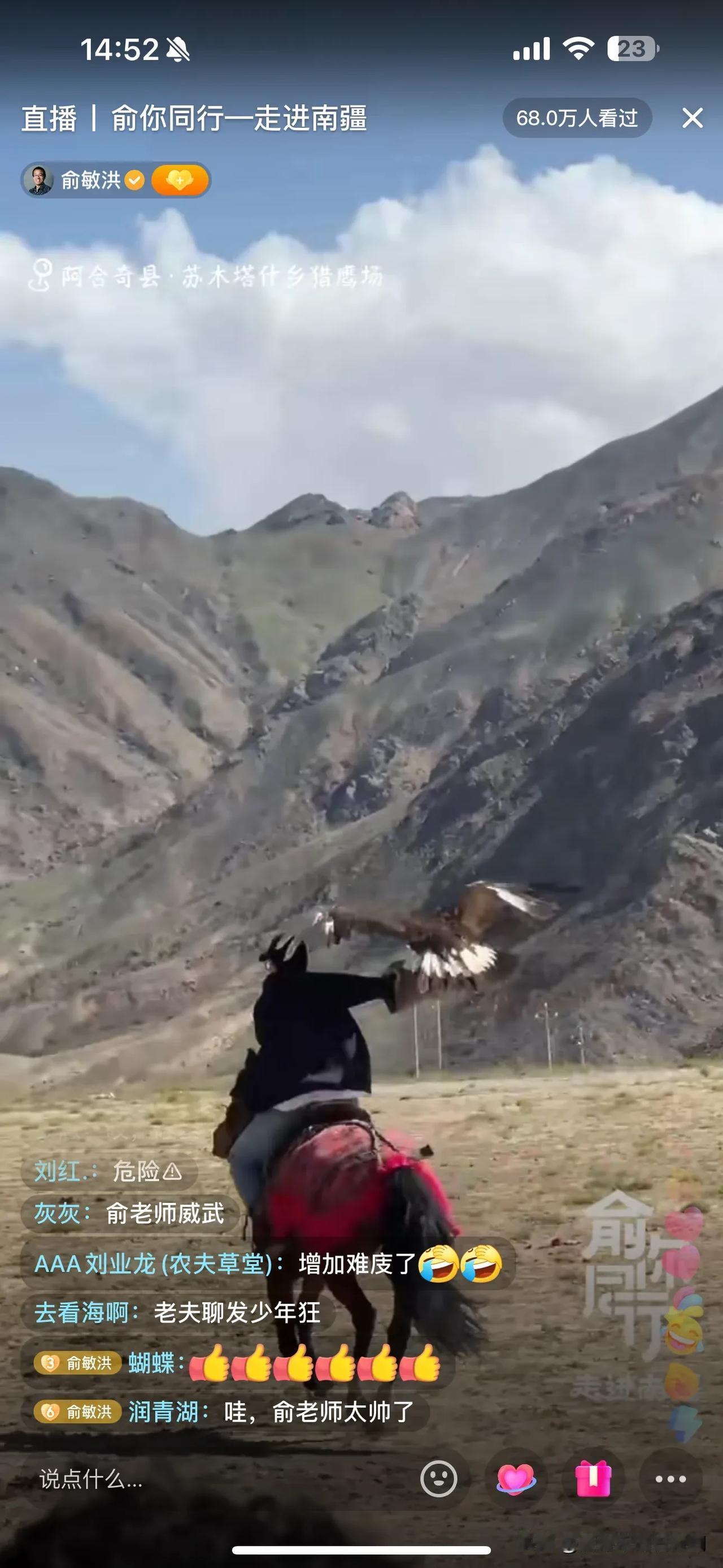 俞敏洪骑马架鹰,太帅了! 老夫聊发少年狂,左牵黄,右擎苍。锦帽貂裘,千骑卷平冈。 这句话形容俞老师这一刻,太符合不过了! 今天俞老师到猎鹰之乡,为大家宣传非遗文化!展示当地的猎鹰节目,由于部分网友感觉猎鹰过程有些残忍! 俞老师和施展老师从人性天生关心弱者,生存法则做了讲解,理解大家的心情,俞老师真是照顾所有人的感情! 俞老老师就停止这类节目的直播,转而体验骑马,还有周成刚,施展老师体验了起马架鹰!另外对非遗文化传人做了采访!比如新疆雄鹰和西藏秃鹰的区别,鹰和隼的区别! 后面依旧给大家展示地方特产,体验地方生活!
