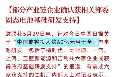 固态电池风在业内盛行,貌似固态电池的春天来了,连国际部都出手了。《中国日报》播报,中国或将投入约60亿元用于全固态电池研发,包括宁德时代、比亚迪、一汽、上汽、卫蓝新能源和吉利共六家企业或获得政府基础研发支持。