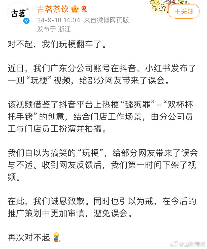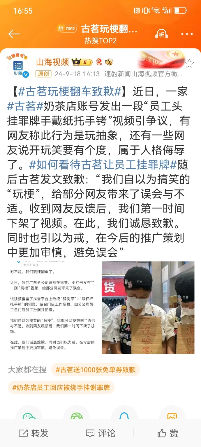 【古茗玩梗翻车致歉 如何看待古茗让员工挂罪牌】此前一些小企业主心理膨胀且阴暗,以为可以肆意羞辱员工。比如逼业绩差的员工吃辣条、吃蚯蚓、吃泥鳅、喝生鸡蛋、做俯卧撑,有男员工因为业绩不达标竟要求脱掉裤子穿上女式丝袜跳舞。如此对员工实施“羞辱性惩罚”,根本上还是“资本性傲慢”,社会应该鄙视,工会应该发声。