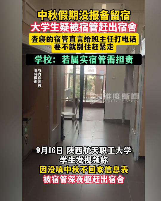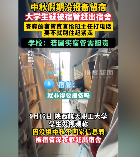 陕西航天职工大学一名学生发视频称,因为自己忘了填写中秋不回家的登记信息表,当天晚上在宿舍竟遭到宿管的驱逐,将他赶出宿舍!身处他乡又将被驱赶出唯一能够安身的宿舍,这名男生的安全遭到众人挂念......