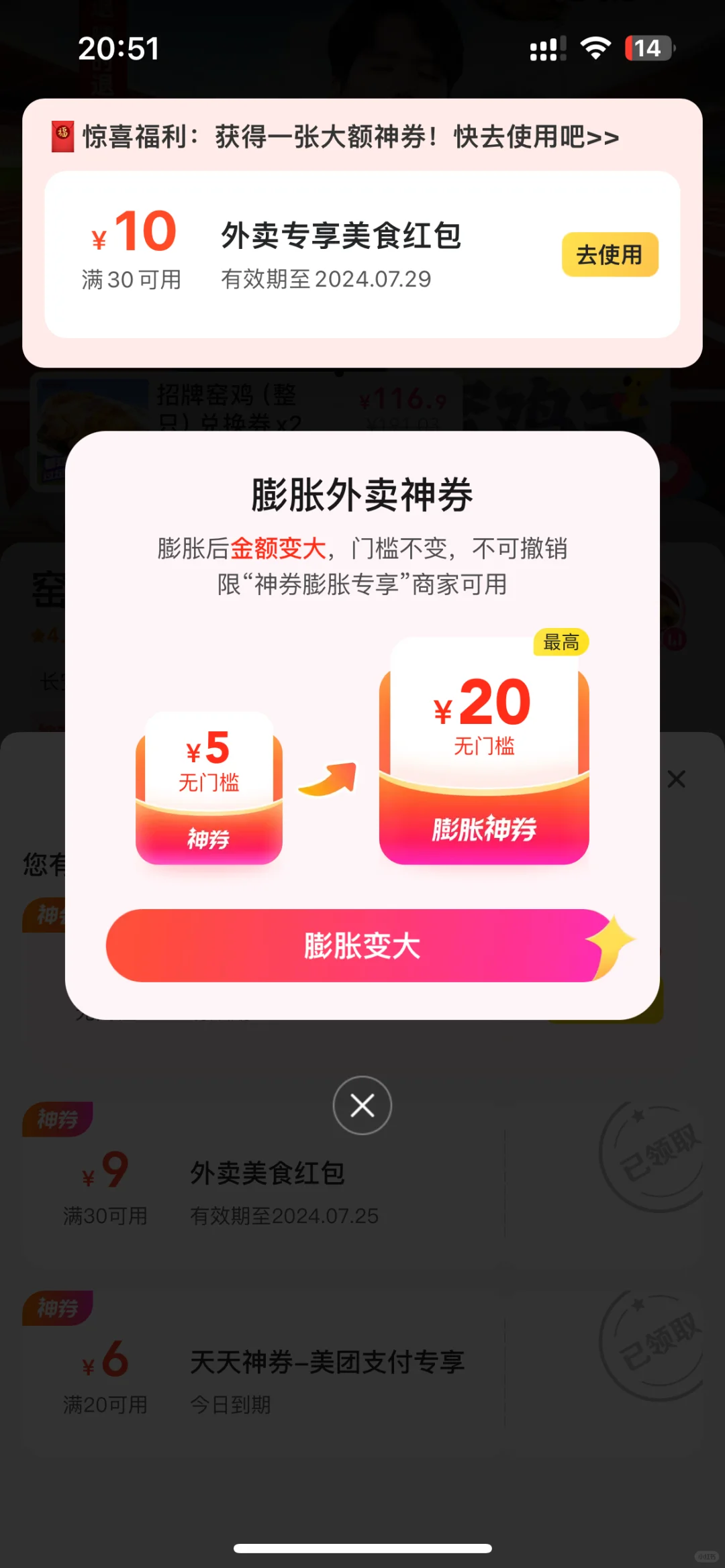 限时抢购2💰就有6张无门槛的膨胀券,最高能膨胀15r加上原本的5r就是20🧧真的轻松实现半价吃外卖~