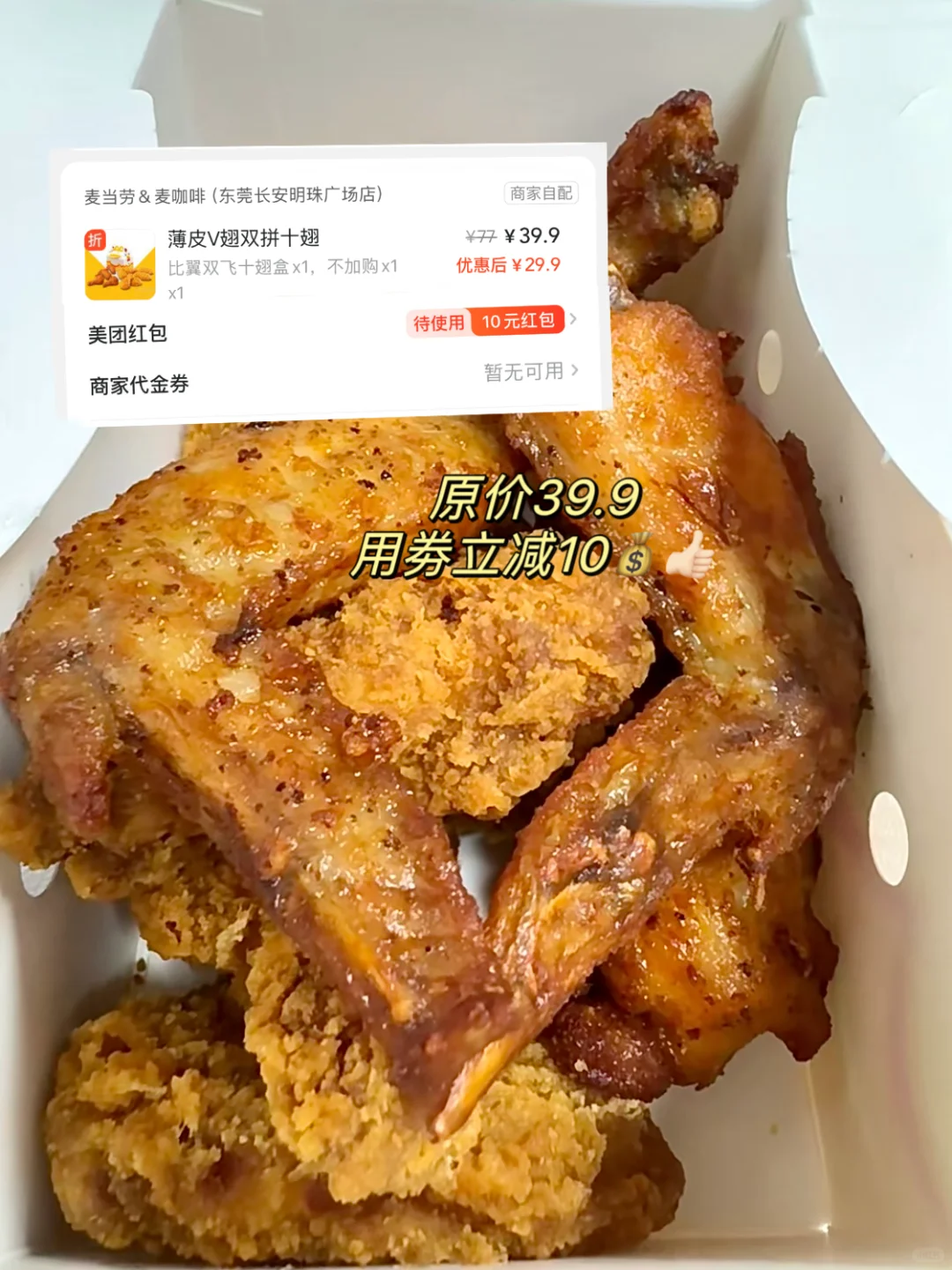 麦当劳薄皮v翅双拼十翅(原价39.9r,券后价29.9r,)