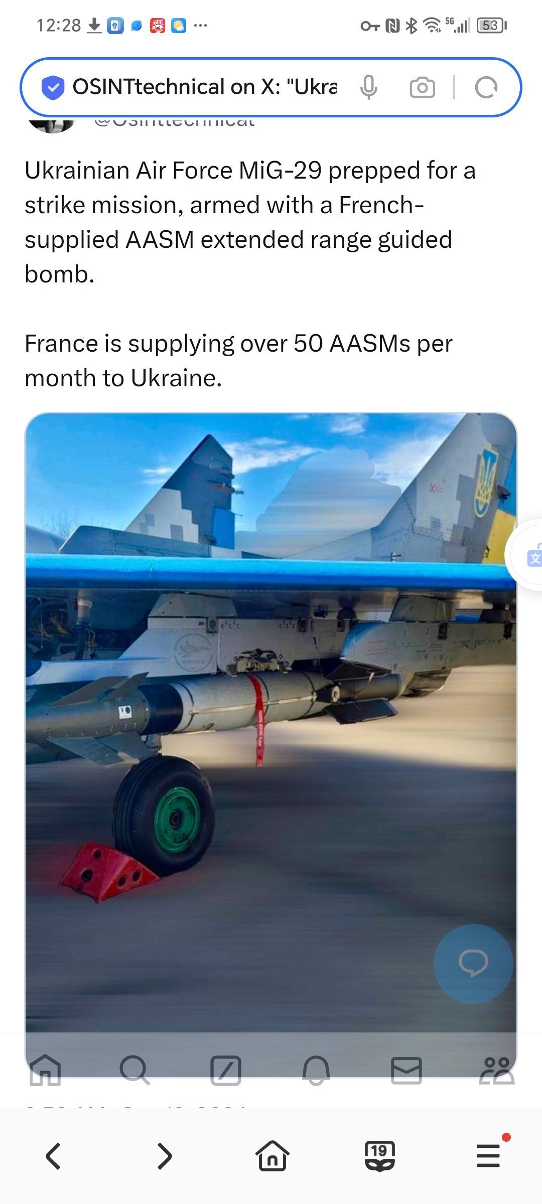 乌克兰空军米格-29准备执行攻击任务,飞机装备有法国提供的 AASM 增程制导炸弹。