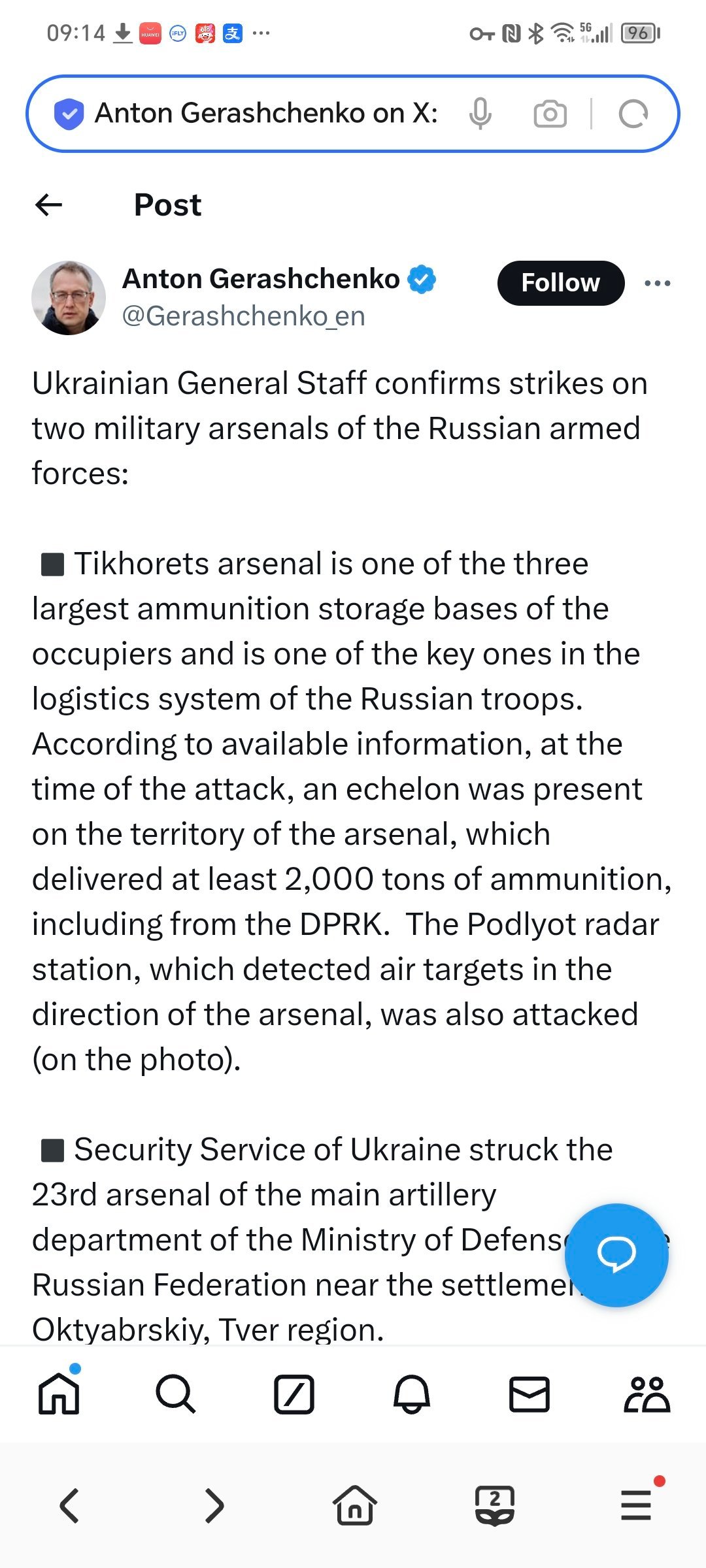 Tikhorets 军火库是俄罗斯入侵者三大弹药储存基地之一,也是俄军后勤系统的关键基地之一。根据现有资料,袭击发生时,军火库内有一个梯队,运送了至少 2 000 吨弹药,其中包括来自朝鲜的弹药。探测军火库方向空中目标的 Podlyot 雷达站也遭到了袭击(如图)。