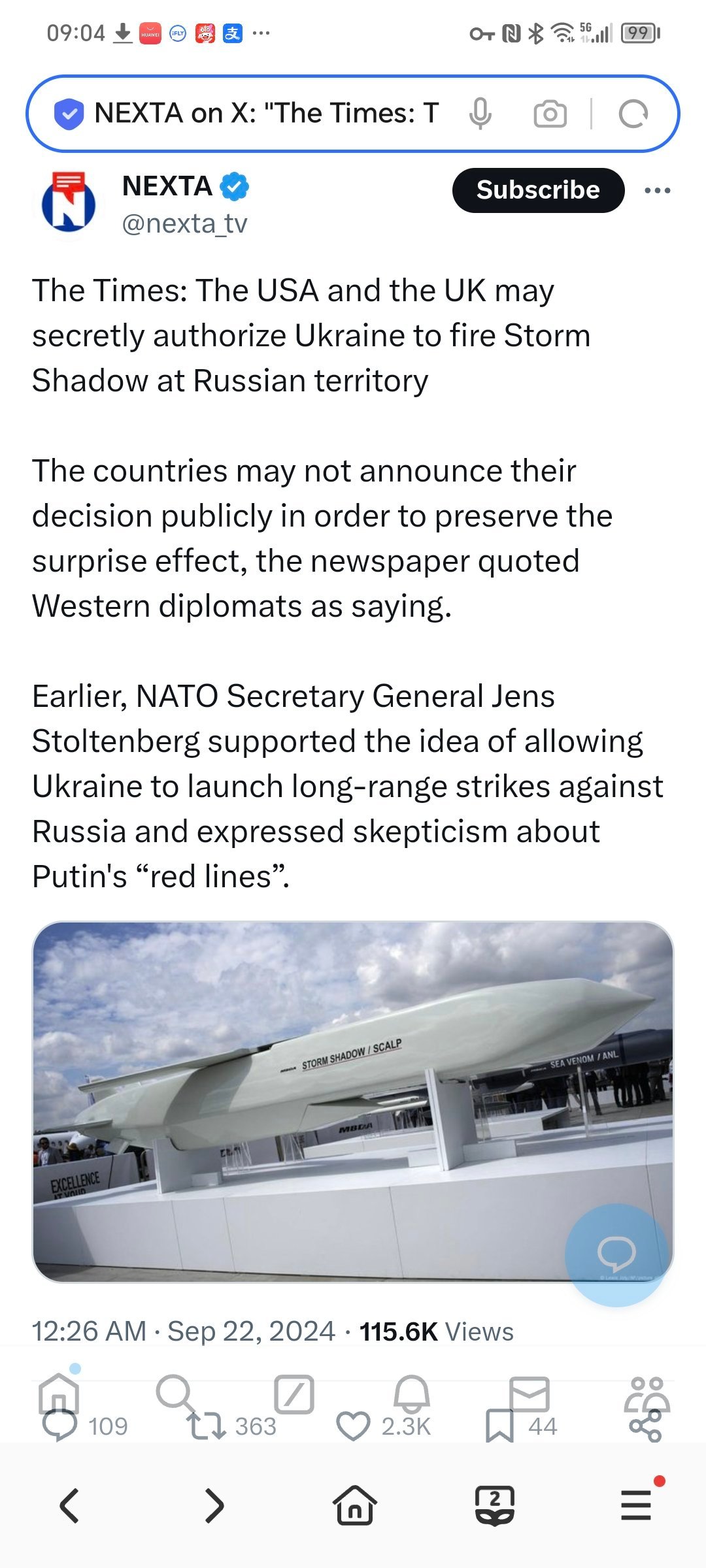 NEXTA:《泰晤士报》宣称美国和英国可能秘密授权乌克兰向俄罗斯领土发射 "风暴阴影 "导弹。
