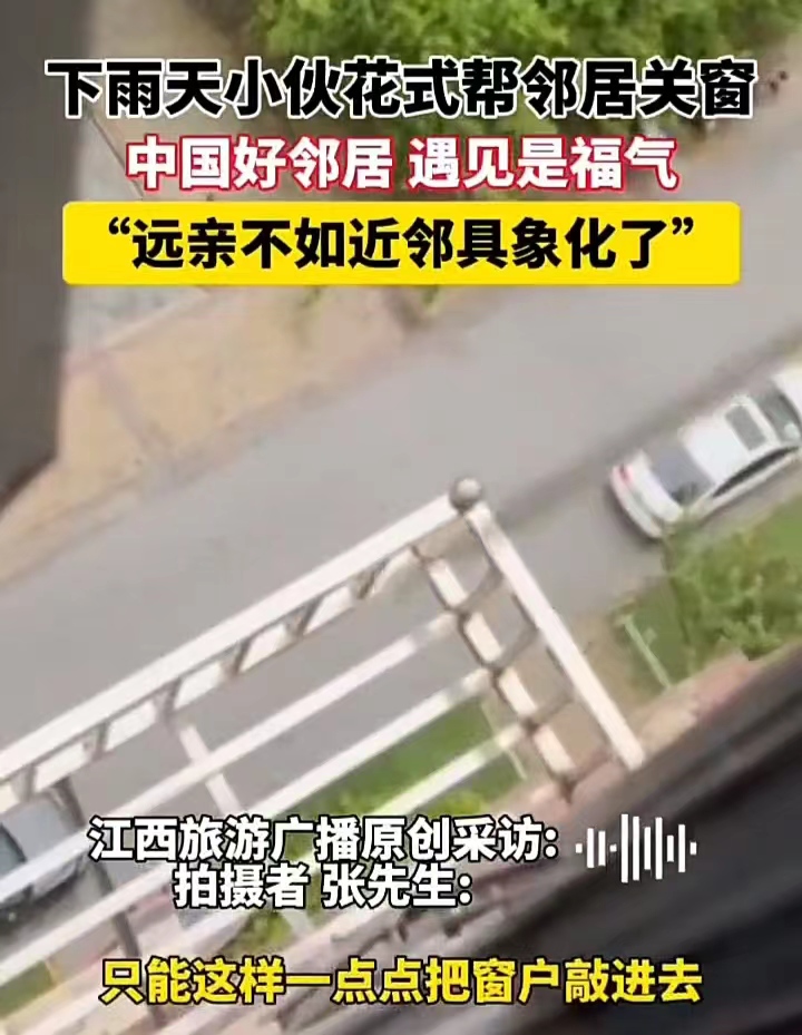 看到这名小伙下雨天帮着邻居关窗户的举动,真的令人感到欣慰。由于邻居不在家,他担心雨水会飘进去打湿东西,这才主动帮忙关窗户,可见他内心十分的热情温暖,有一句话叫“远亲不如近邻”,这样的邻里关系也是相当融洽了。大家怎么看呢?