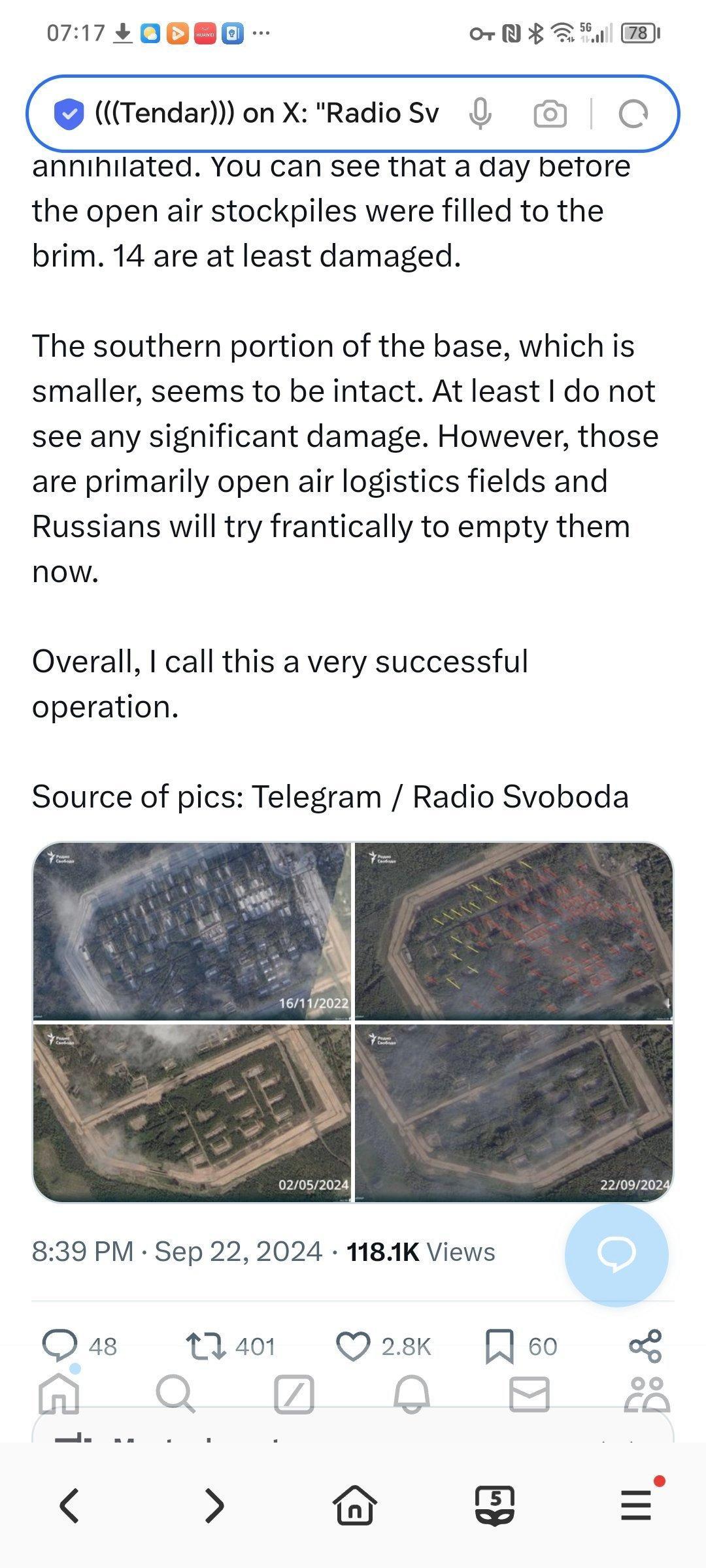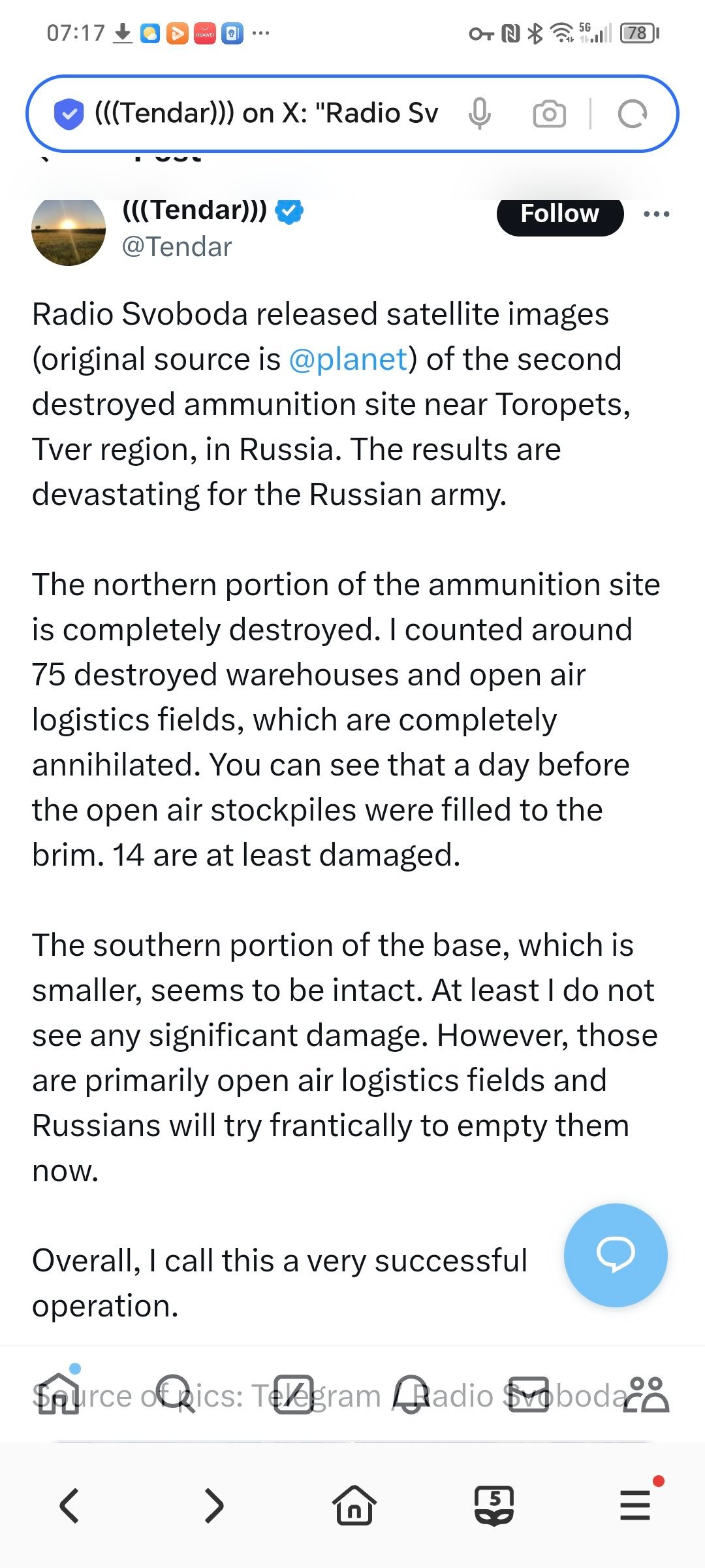 Svoboda 电台发布了俄罗斯特维尔地区托罗佩茨附近第二个被摧毁的俄军弹药库的卫星图像(原始来源为