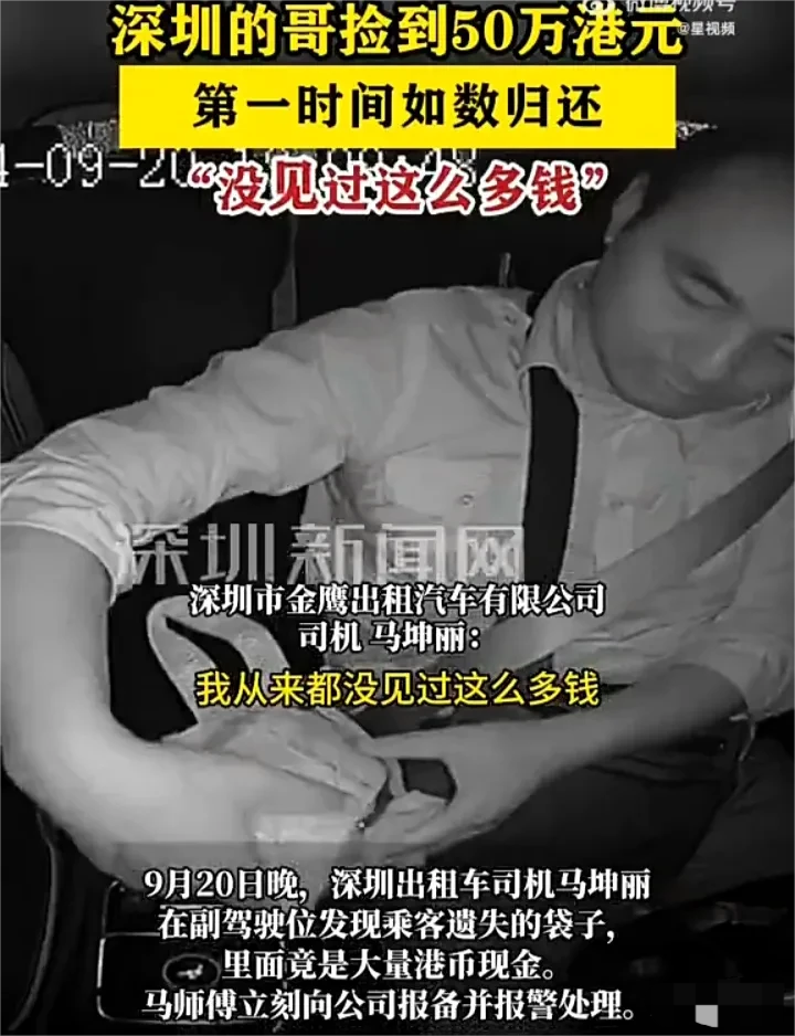 善良的司机!9月20日,广东深圳一位出租车司机开车时,发现副驾位置有乘客遗失的袋子,里面装着大量港元现金,于是他立刻向公司报备,并报警处理。事后他在民警和车队长的见证下,将50万港元归还给失主。