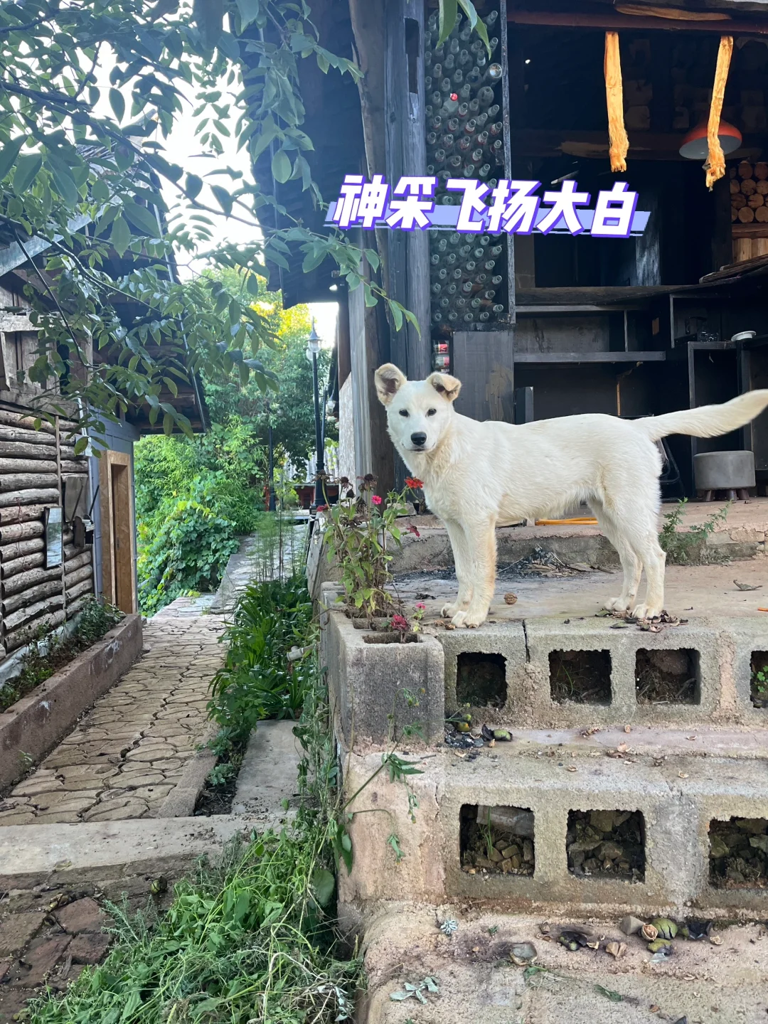 这儿养了一对小白狗,特别亲人,尤其妹妹小白,喜欢脑袋搭在你腿上撒娇,散步会回头等你(但她俩因为又偷吃了一只小母鸡,第二天就暂时坐大牢了)。