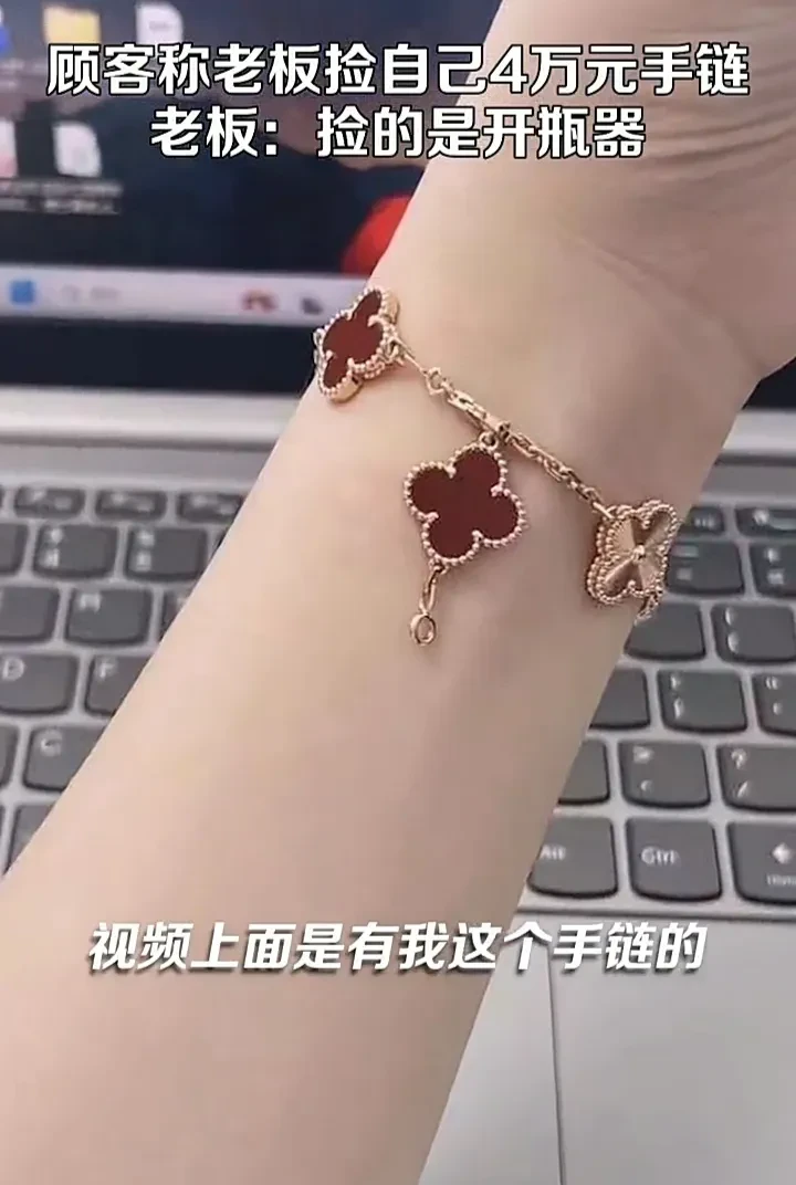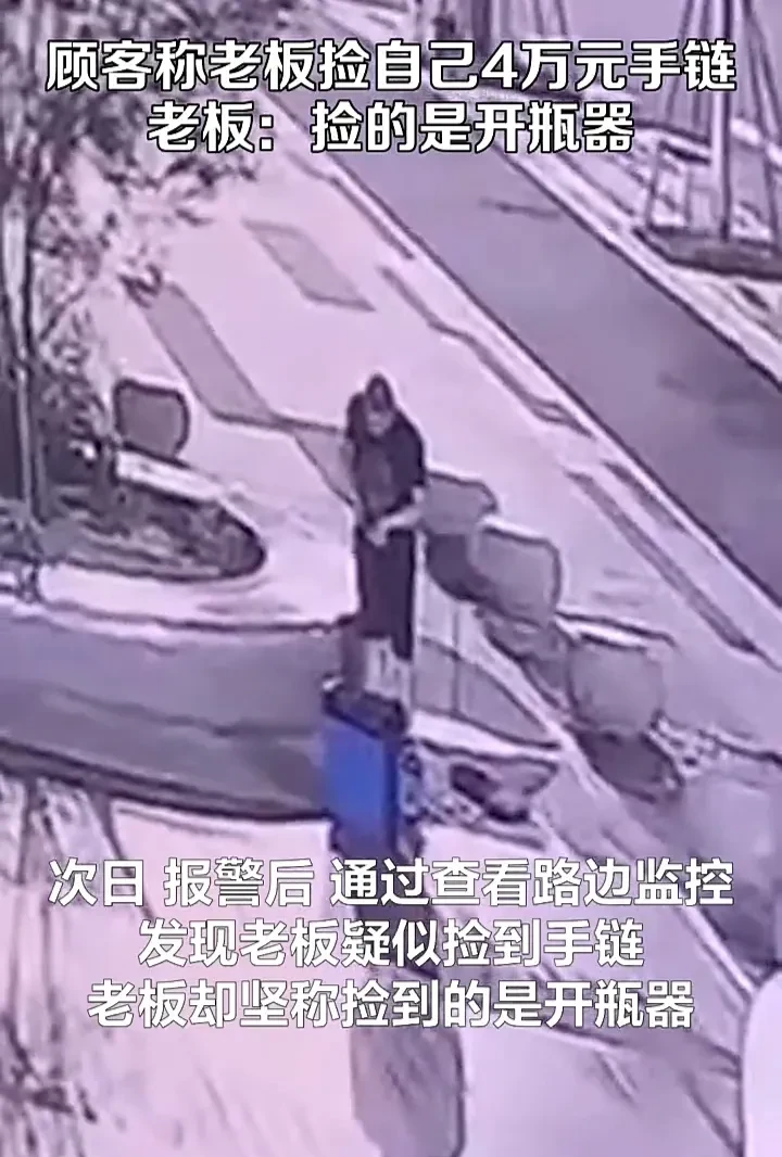 9月21日,浙江杭州一名女子在一家烤串店吃饭时,不慎遗失了价值4万元的手链,之后她询问店主有没有捡到,店主回答没有。事后女子报警查询监控,发现店主疑似捡到类似物品,但店主表示捡到的是开瓶器。