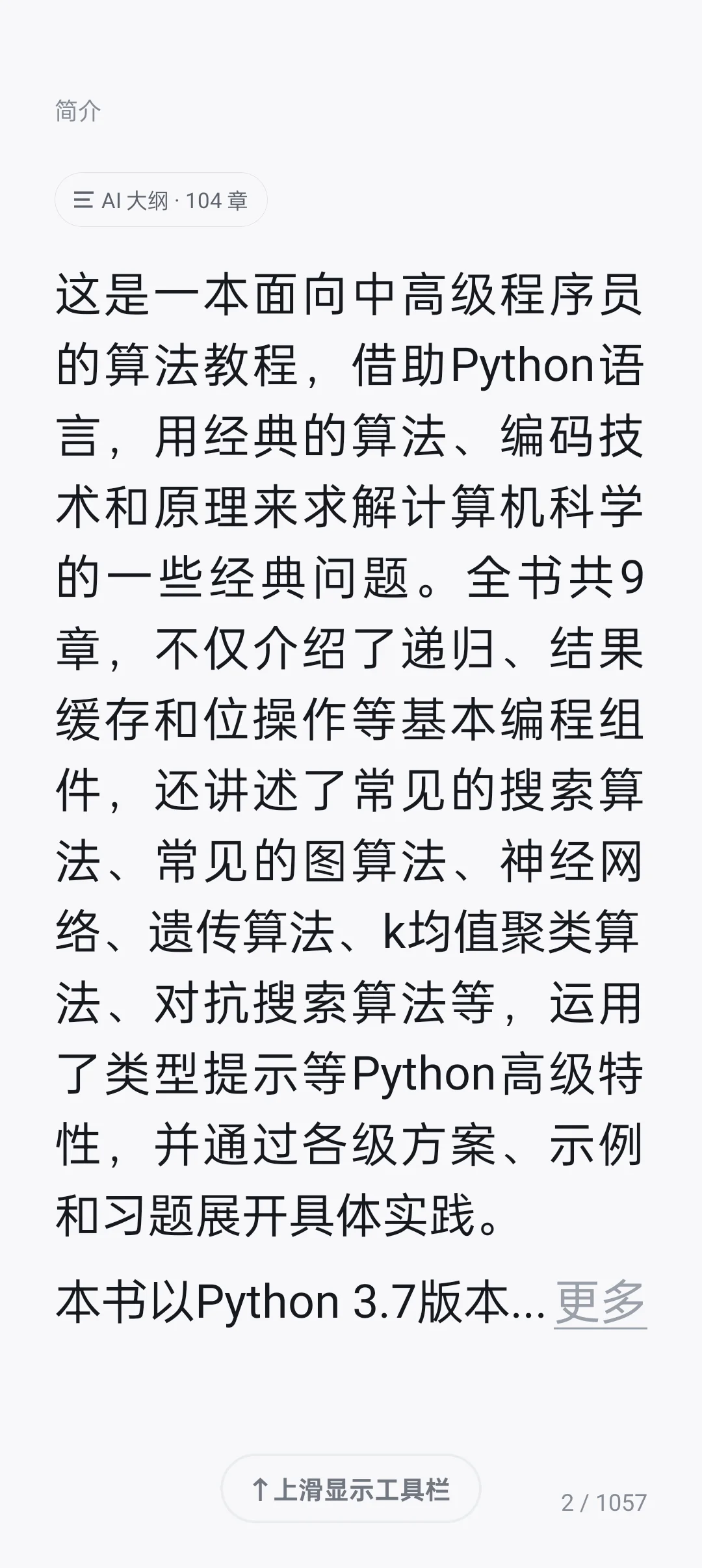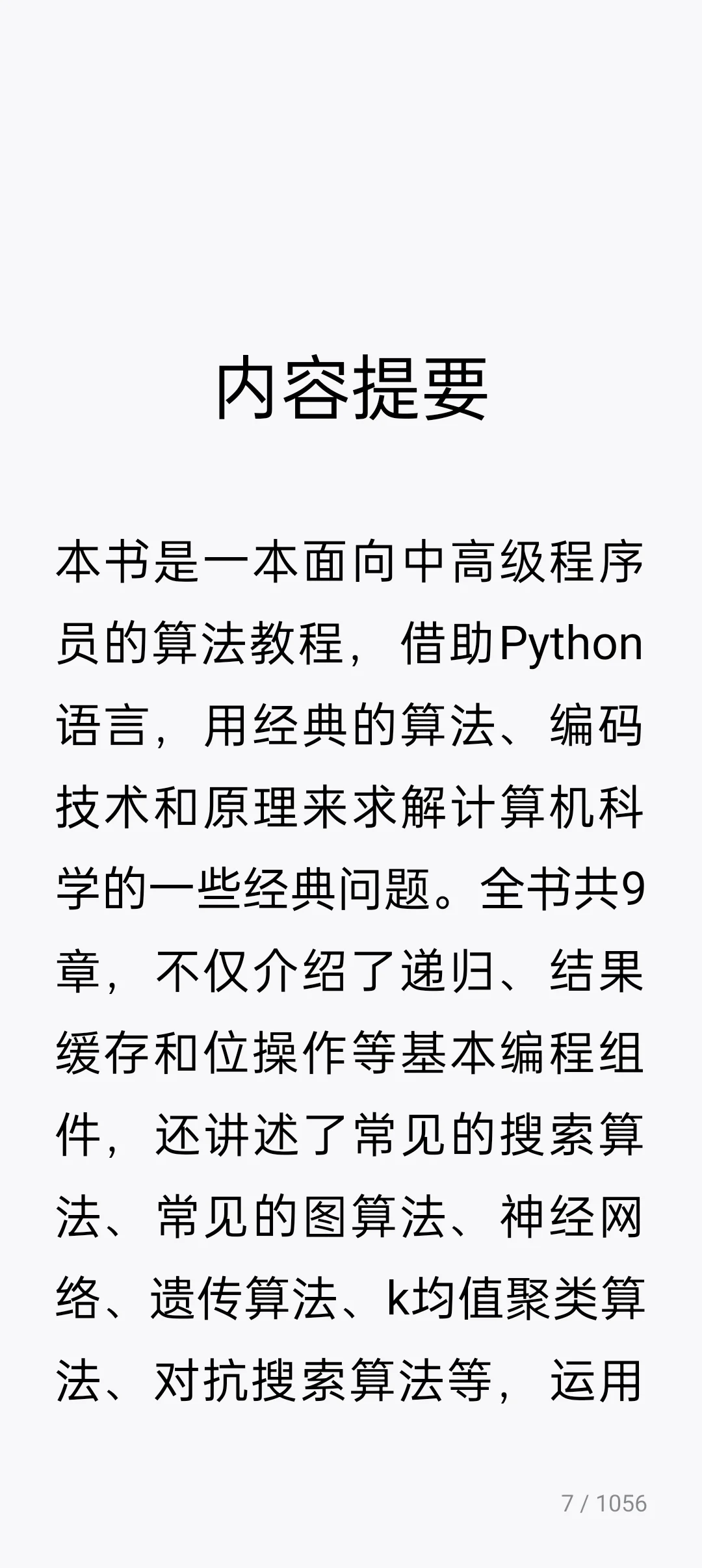 全书共9章,不仅介绍了递归、结果缓存和位操作等基本编程组件,还讲述了常见的搜索算法、常见的图算法、神经网络、遗传算法、k均值聚类算法、对抗搜索算法等,运用了类型提示等Python高级特性,并通过各级方案、示例和习题展开具体实践。