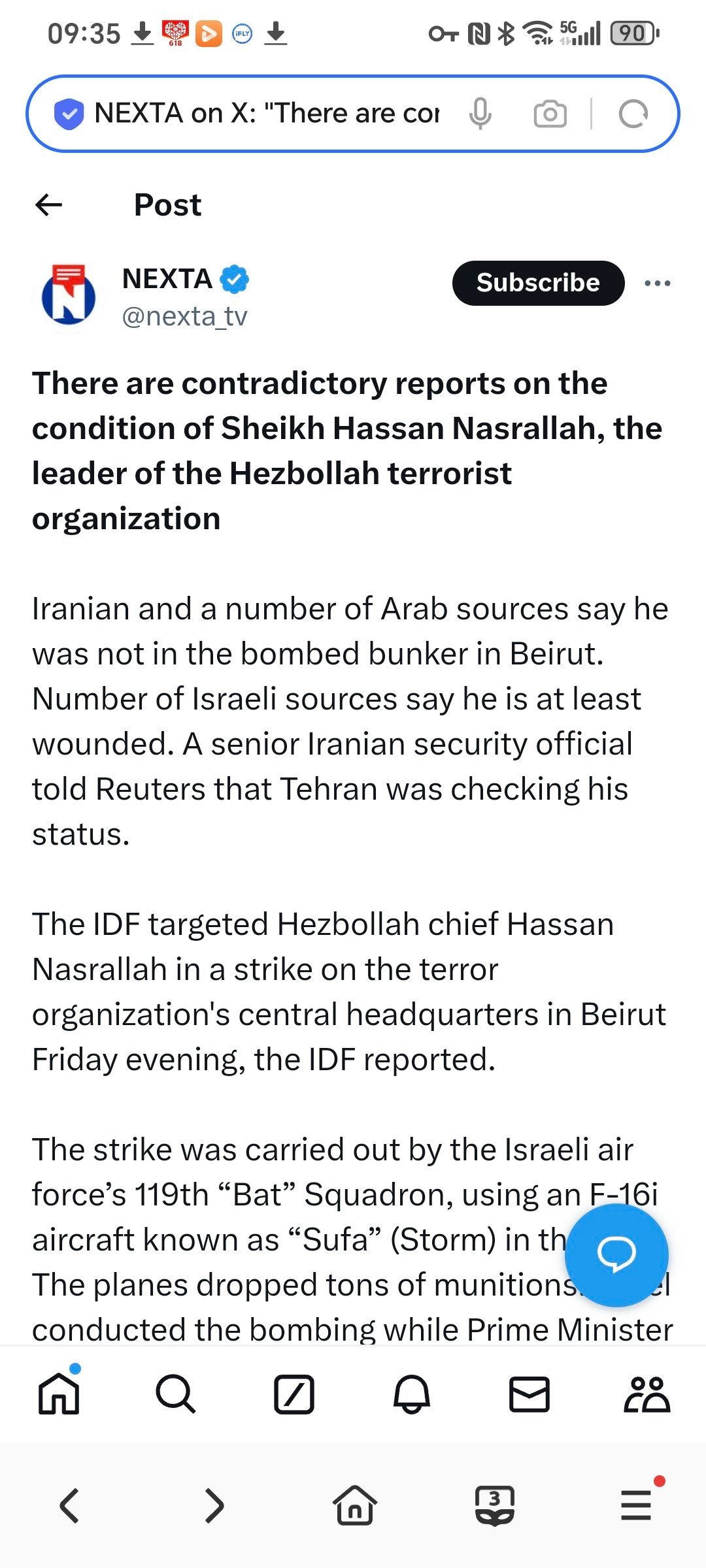 关于真主党恐怖组织领dao人谢赫-哈桑-纳斯鲁拉(Sheikh Hassan Nasrallah)状况的一些相互矛盾的报道——
