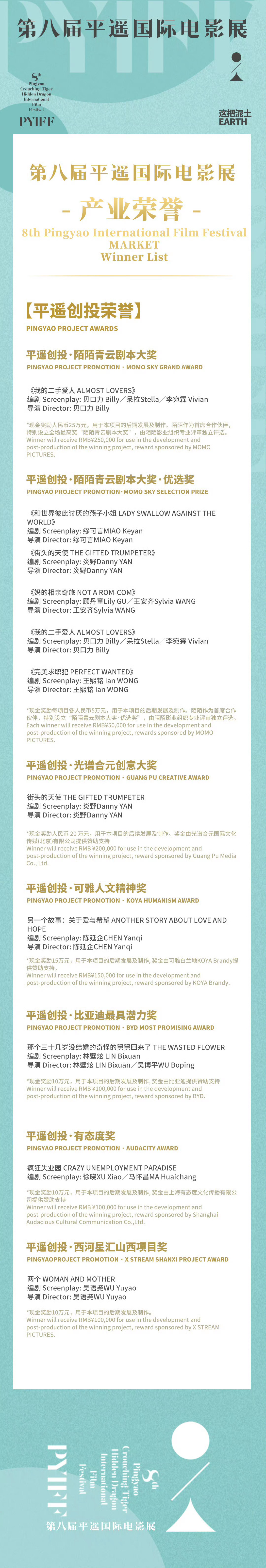 平遥创投·陌陌青云剧大奖·优选奖:《和世界彼此讨厌的燕子》缪可言、《街头的天使》炎野、《妈的相亲之旅》顾丹彤 王安齐、《我的二手爱人》贝口利、《完美求职犯》王熙铭