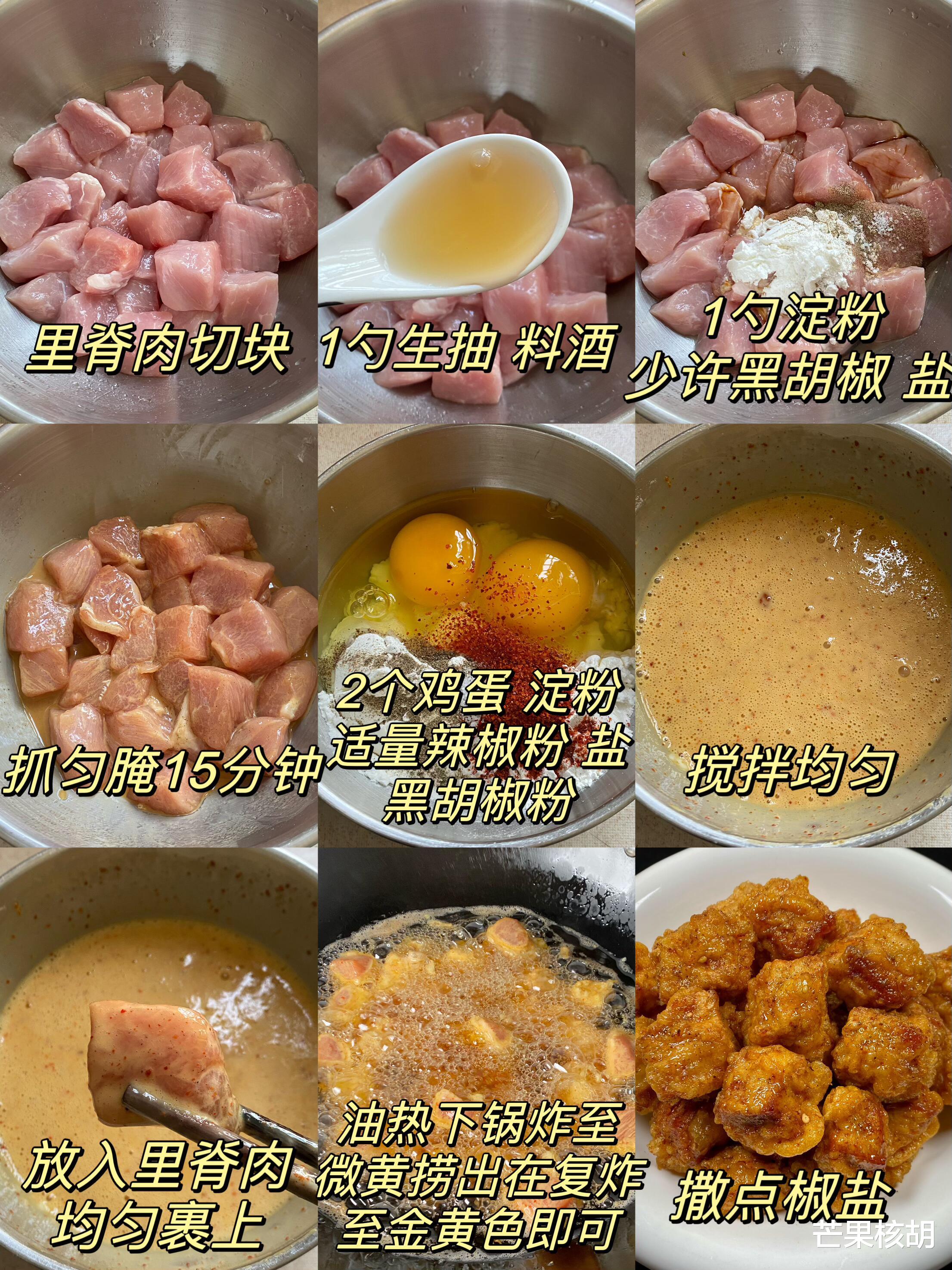 在锅里倒入足量的食用油,开中火加热。油温五六成热的时候,可以丢一小块面糊进去试试,如果面糊迅速浮起并变成金黄色,那就说明油温合适啦。把裹好面糊的里脊肉放入锅中,炸至微黄后捞出 。这时候的里脊肉其实已经半熟了,但还不够酥脆。等所有里脊肉都炸到微黄后,把油温升高到七八成热,再将里脊肉倒入锅中复炸一次 。这次炸至金黄色就可以捞出啦,复炸能让里脊肉的外皮更加酥脆,口感层次更丰富。