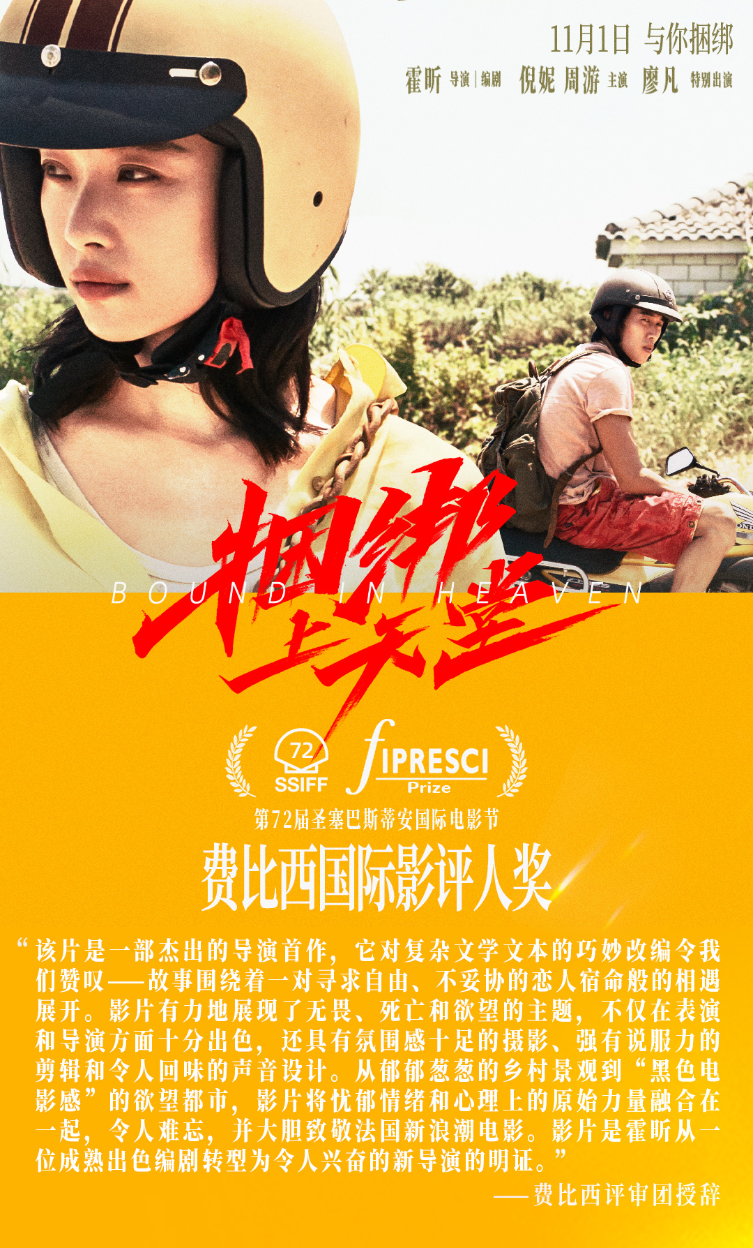 费比西评委团授辞:“该片(《捆绑上天堂》是一部杰出的导演首作,它对复杂文学文本的巧妙改编令我们赞叹——故事围绕着一对寻求自由、不妥协的恋人宿命般的相遇展开。影片有力地展现了无畏、死亡和欲望的主题,不仅在表演和导演方面十分出色,还具有氛围感十足的摄影、强有说服力的剪辑和令人回味的声音设计。从郁郁葱葱的乡村景观’黑色电影感‘的欲望都市,影片将忧郁情绪和心理上的原始力量融合在一起,令人难忘,并大胆致敬法国新浪潮电影。影片是霍昕从一位成熟出色编剧转型为令人兴奋的新导演的明证。”#倪妮红裙生图#