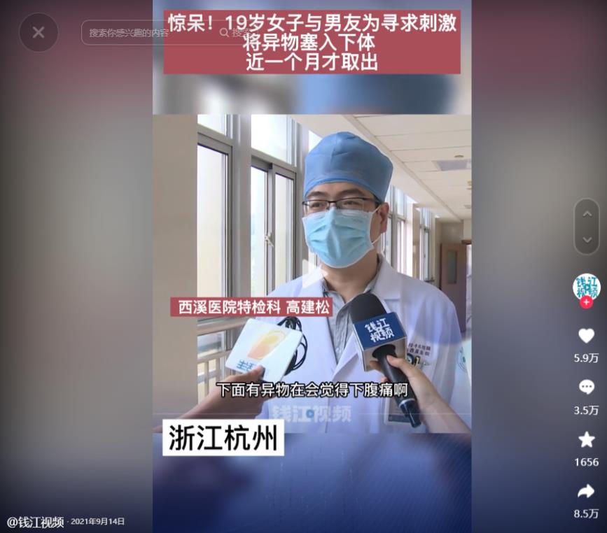 (本文主要参考信源:钱江视频.为寻求刺激,19岁女子竟遭遇了这件疯狂事 #女子为寻刺激将异物塞入体内 #关爱健康.2021.09.14)