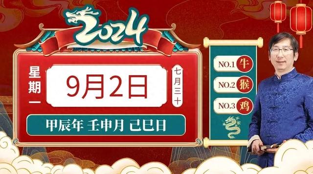 小运播报:2024年9月2日,星期一,农历七月三十 (甲辰年壬申月己巳日),法定工作日。红榜生肖:牛、猴、鸡需要注意:鼠、虎、猪喜神方位:东北方财神方位:正北方宜:结婚、订婚、搬家、宴会、开业、交易、签约、置业、纳财、出货、进人口、动土、兴造、装修忌:出行、解除幸运数字:9、0幸运颜色:白色、棕色、金色