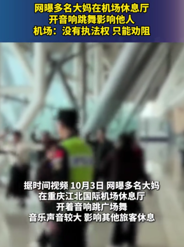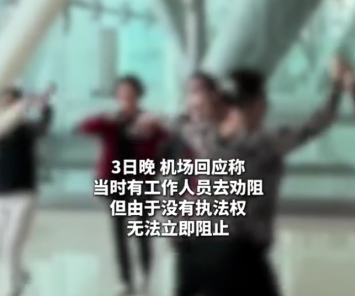 对此,机场回应表示,当时有工作人员去劝阻,但她们是比较固执的,因为没有执法权,所以只能让她们把声音降低些