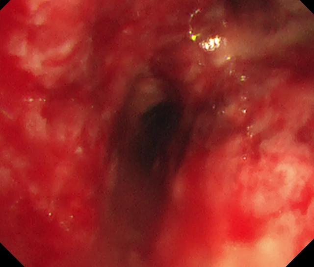 病因四:非感染性疾病的常见原因为复发性多软骨炎,其他包括肉芽肿性多血管炎(韦格纳肉芽肿)也有累及中心气道的病例。病例7,男,56岁,咳嗽咳痰伴气促半年,我院确诊复发性多软骨炎,气管镜下表现为气道弥漫性软骨环消失,管壁塌陷,Y型金属支架植入后患者症状好转。病例8,男,51岁,肉芽肿性多血管炎,右主支气管及右中间段支气管粘膜肿胀粗糙,表面弥漫坏死,管腔狭窄,经激素治疗后好转(见下图)