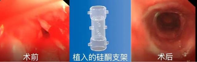 又是一例典型的气管插管后气管狭窄病例,气管插管或气管切开后气管狭窄已经成为我国第二大良性气道狭窄原因,仅次于支气管结核。发生的主要原因是气管插管后套囊压力过大或麻醉镇静过浅,压迫摩擦损伤气道黏膜,或切开损伤气管软骨,导致气管肉芽组织增生疤痕挛缩和(或)软骨支撑结构破坏,最终引起不同程度的气管狭窄。针对该患者,我们紧急安排了全麻气管镜手术,术中可见声门下气管显著狭窄,软骨环塌陷明显,多次球囊扩张后气管仍无法保持有效扩张,因此我们术中植入了一枚沙漏型硅酮支架(16-14-16mm),植入硅酮支架后患者气管管径较前明显增大。术后患者症状明显好转。
