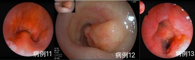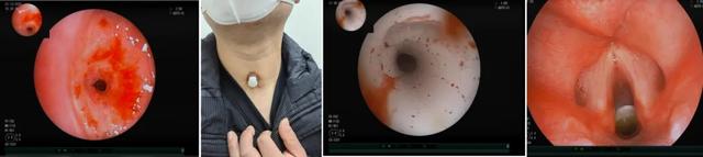 图:病例3 气管黏膜糜烂坏死、病例4 患者左主支气管疤痕狭窄