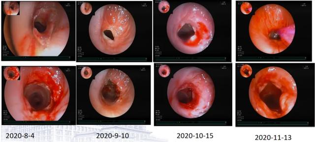 然而,该患者仍反复出现支架上缘的肉芽组织增生,基本每隔一个月就需气管镜下清理一次,下图可直接地看到反复肉芽生长。患者和家属又一次失去治疗的耐心,我们下一步该何去何从?(下图为多次气管镜下治疗的图像,上图为治疗前,下图为治疗后)