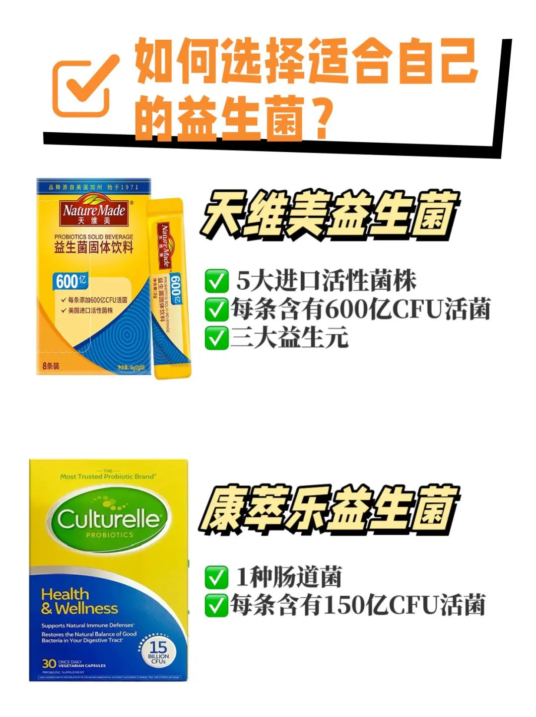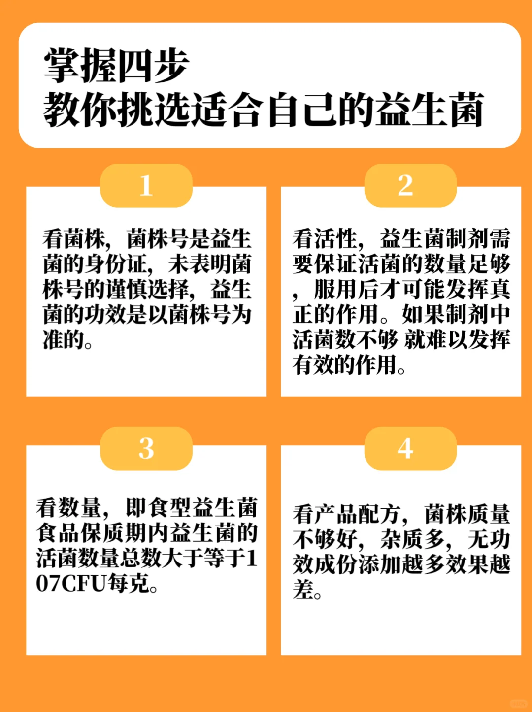 掌握四步 教你挑选适合自己的益生菌 1、看菌株,菌株号是益生菌的身份证,未表明菌株号的谨慎选择,益生菌的功效是以菌株号为准的。 2、看活性,益生菌制剂需要保证活菌的数量足够,服用后才可能发挥真正的作用。如果制剂中活菌数不够 就难以发挥有效的作用。 3、看数量,即食型益生菌食品保质期内益生菌的活菌数量总数大于等于107CFU每克。 4、看产品配方,菌株质量不够好,杂质多,无功效成份添加越多效果越差。