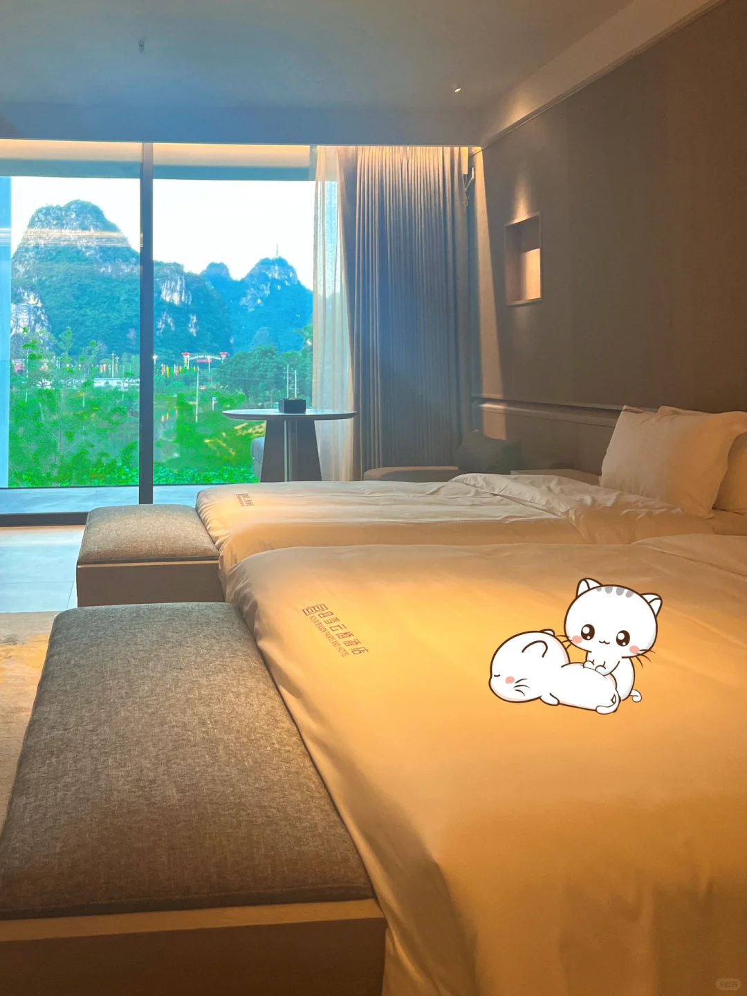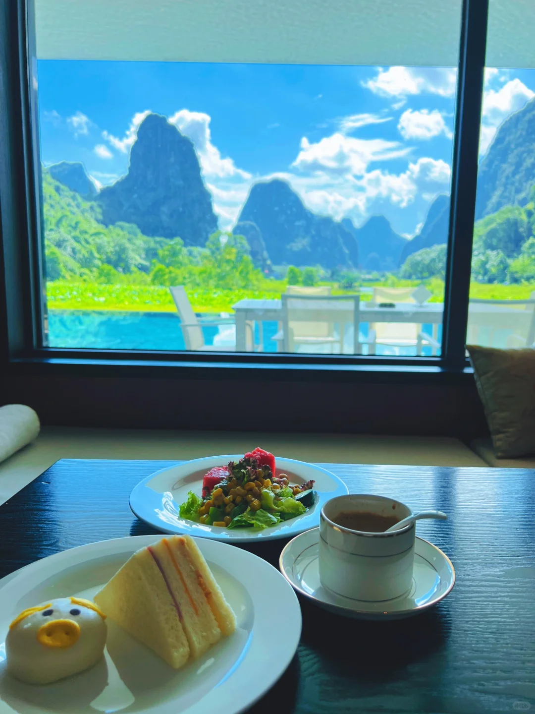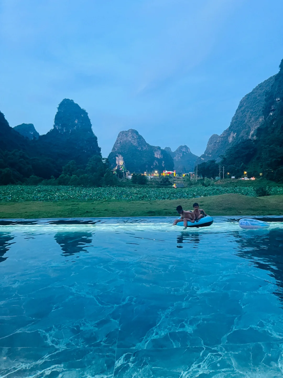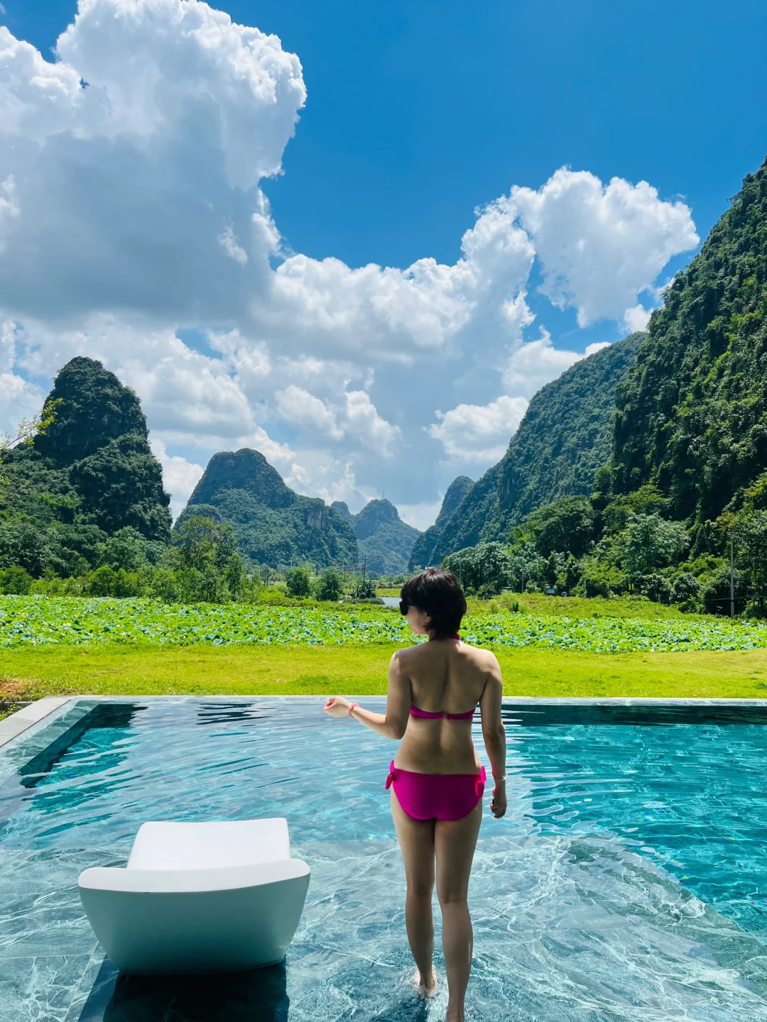 到酒店下车的一瞬间 就被眼前的这番美景震撼了! 这片山水,如诗如画,云雾缭绕间仿佛仙境降临,漫步其中 只见青山叠翠每一处都是绝美的风景 太爱了😍 酒店门前就是一个无边泳池,能在如此美景前畅游 让我迫不及待换上👙下水,这感觉太美妙了 太舒畅了😌
