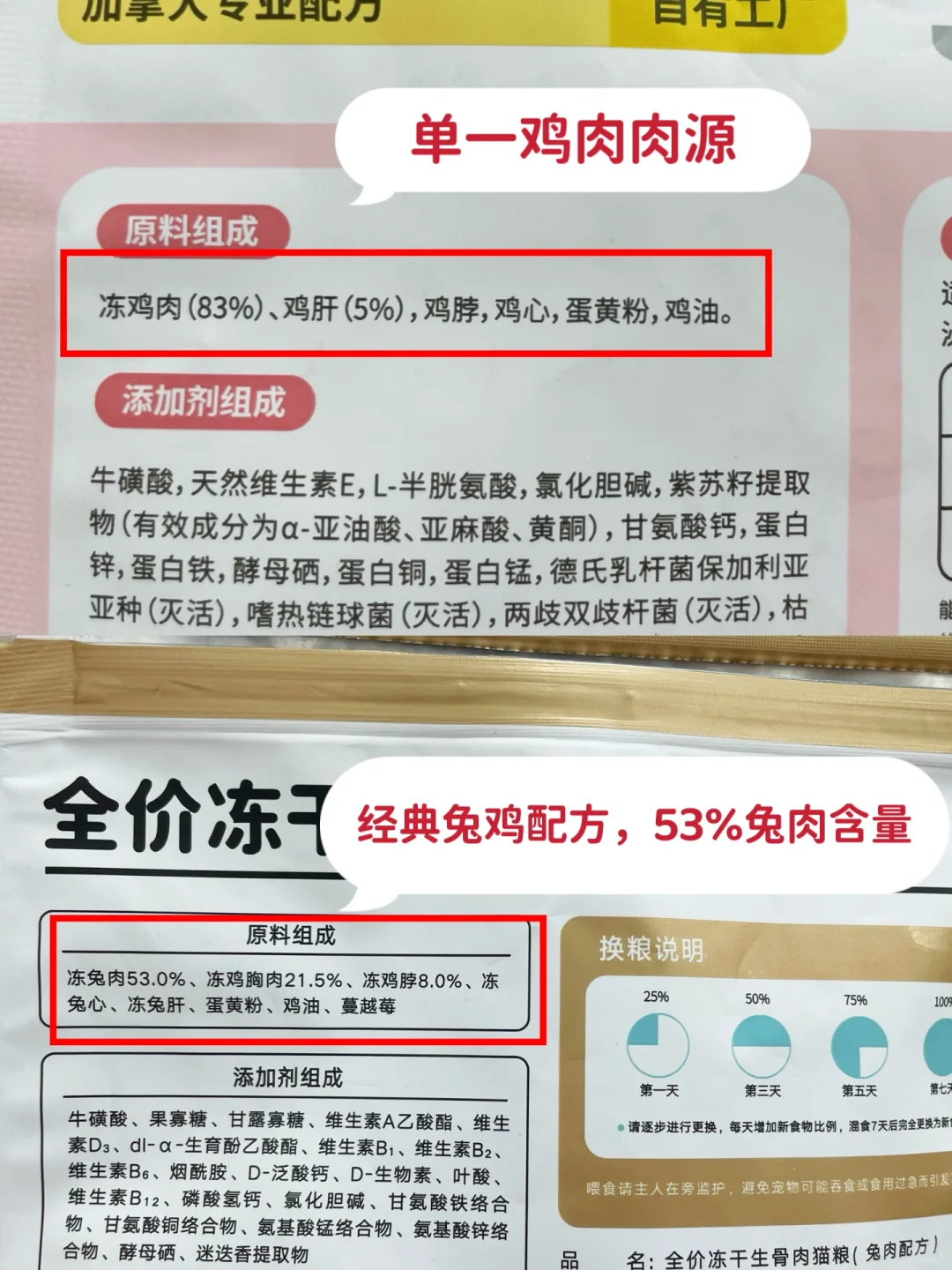 两款都差不多都是98%的动物性原料,江小傲的兔肉是0谷物0淀粉的。
