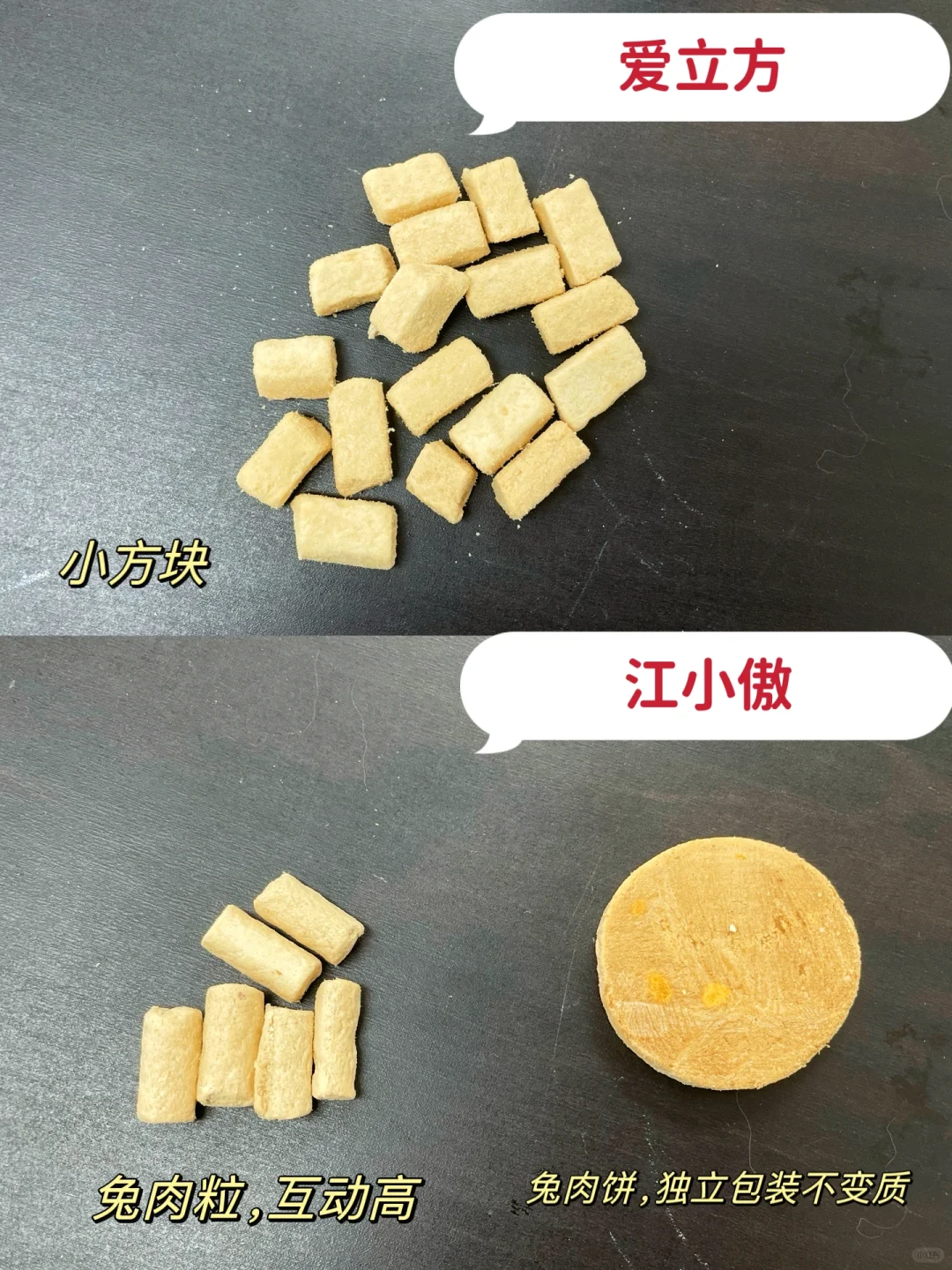 爱立方的话我家比较爱吃鸡肉和鸭肉的,其他的适口性没有这两款好,颗粒是比较酥脆的长方块状,也很好掰开,复水是能骗很久。