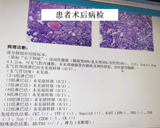 术后病检示:肿瘤直径约3厘米,中分化腺癌,多组清扫淋巴结未发现转移,未发现胸膜侵犯。术后分期:1A3期。