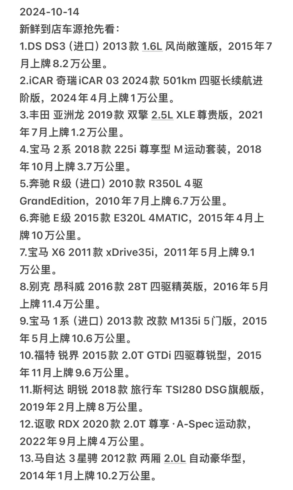 2024.10.14。新鲜到店车源抢先看,感兴趣随时私信我们,详细信息在最后一页噢。