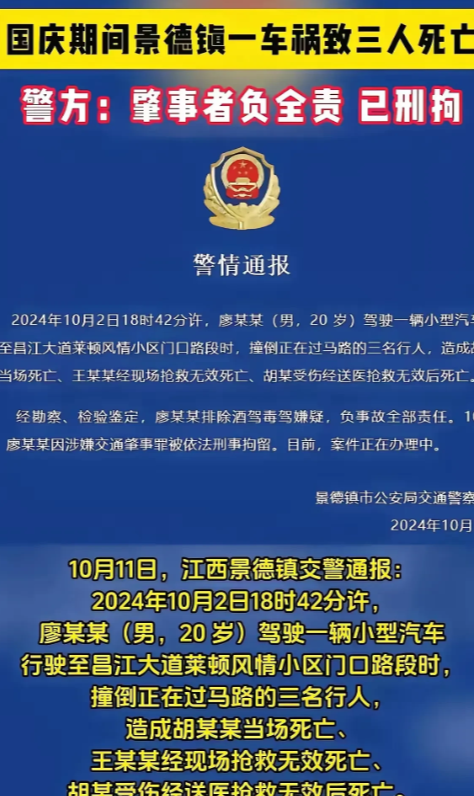 景德镇交通肇事案官方通报来了!肇事司机已被刑拘,性质相当恶劣,在撞人之后不仅没有悔过,没有害怕,还对着副驾驶婴儿的遗体哈哈大笑,恶劣程度令人发指!