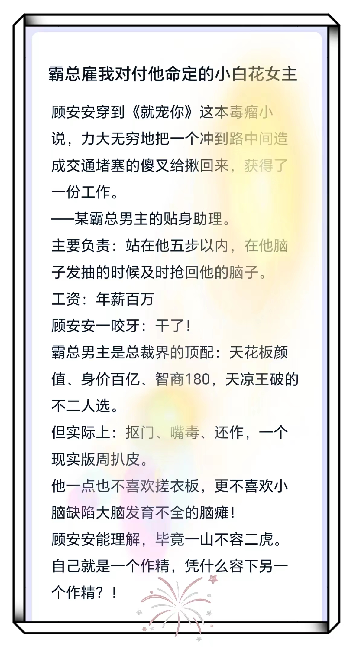 很沙雕搞笑的一文,小白花苏软每次一哭唧唧,就有大批拥护男配当她的帮手,连本文最厉害的霸总男主都不能幸免。每次小白花出现,男主的大脑清醒的,但是身体总是控制不住做一些无脑的事。后来男主终于发现bug了,只要沙雕顾安安出现,他就不会受小白花影响。于是他决定雇她对付小白花,当老板掐着女主角的搓衣板腰,在高定设计师面前指点江山。